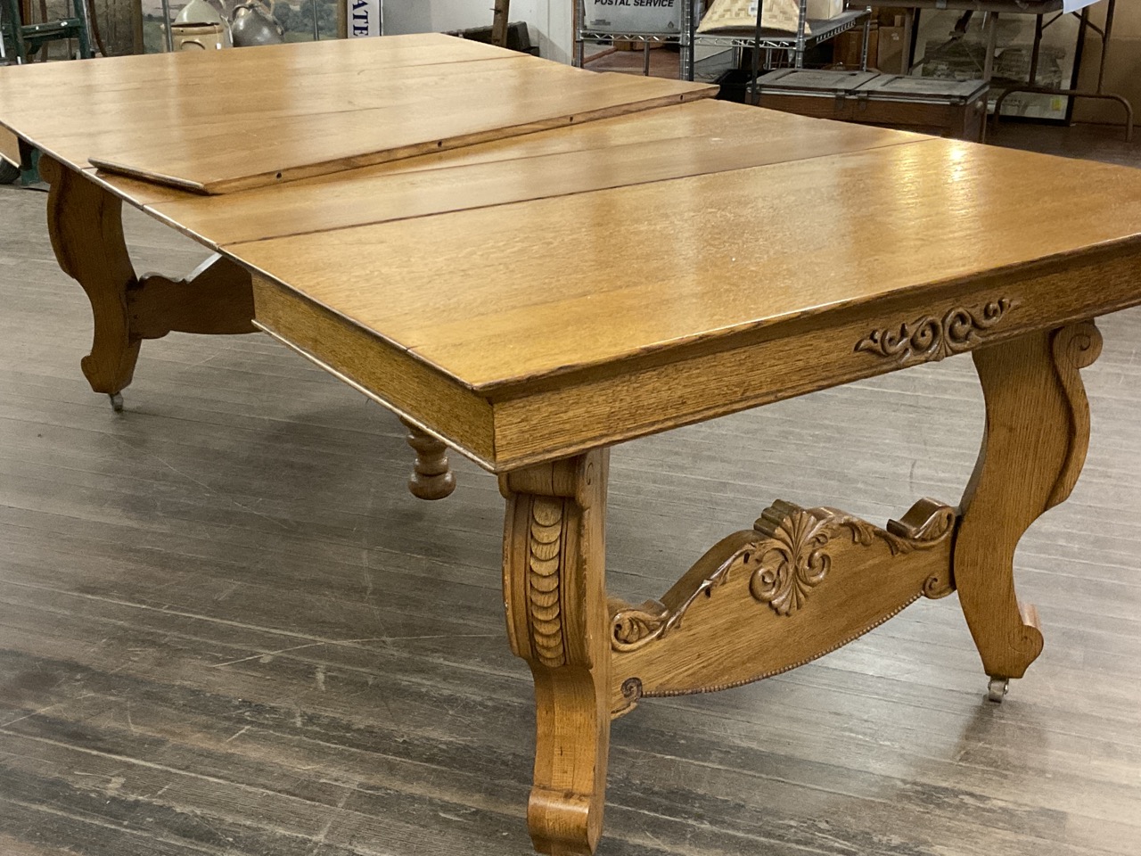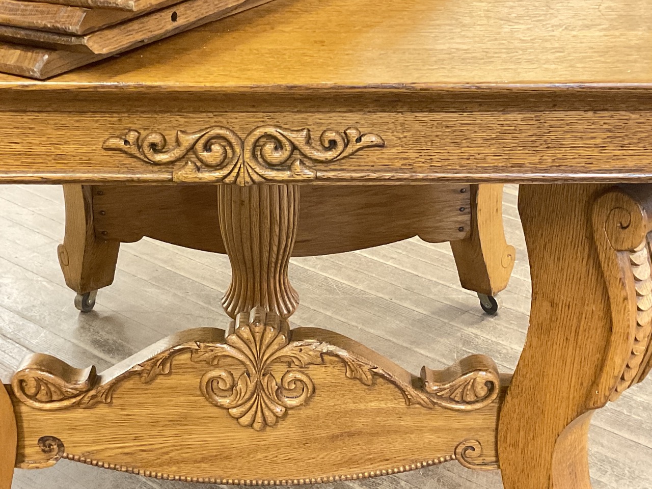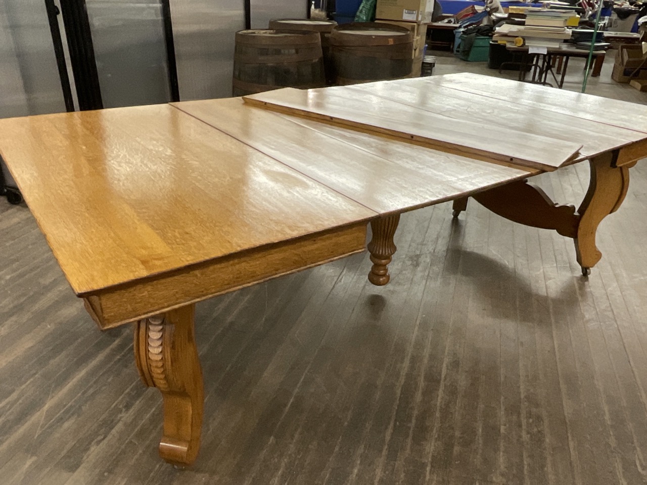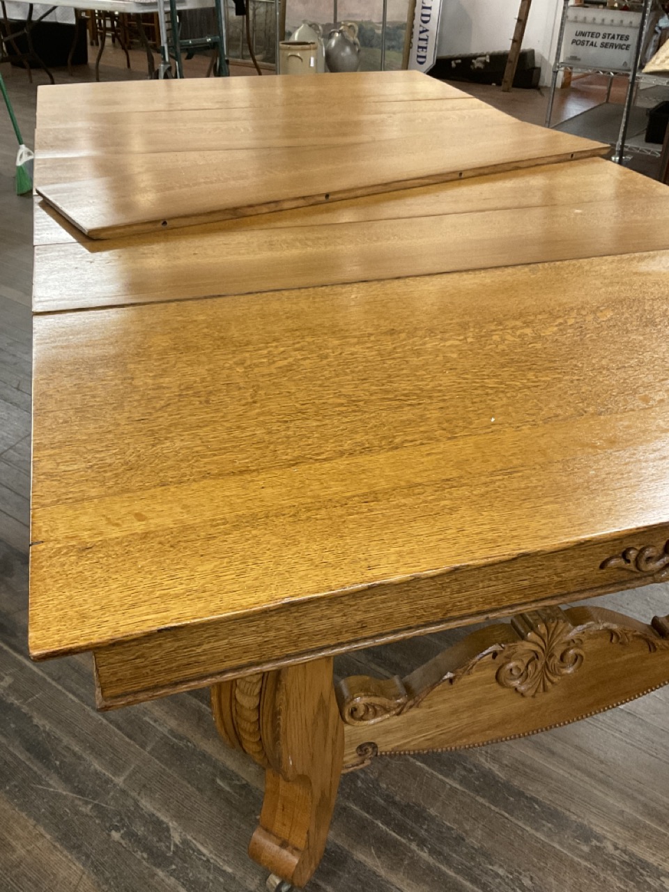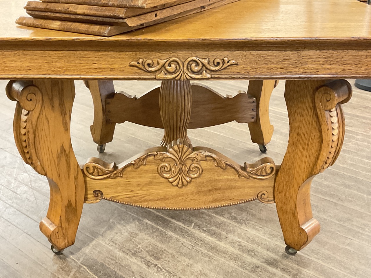 An American Victorian era golden oak square dining room table. Ideal dimensions for farmhouse, Six 11" leaves included!!