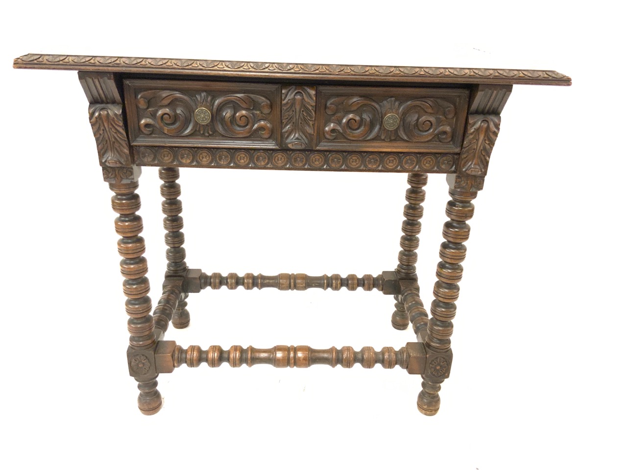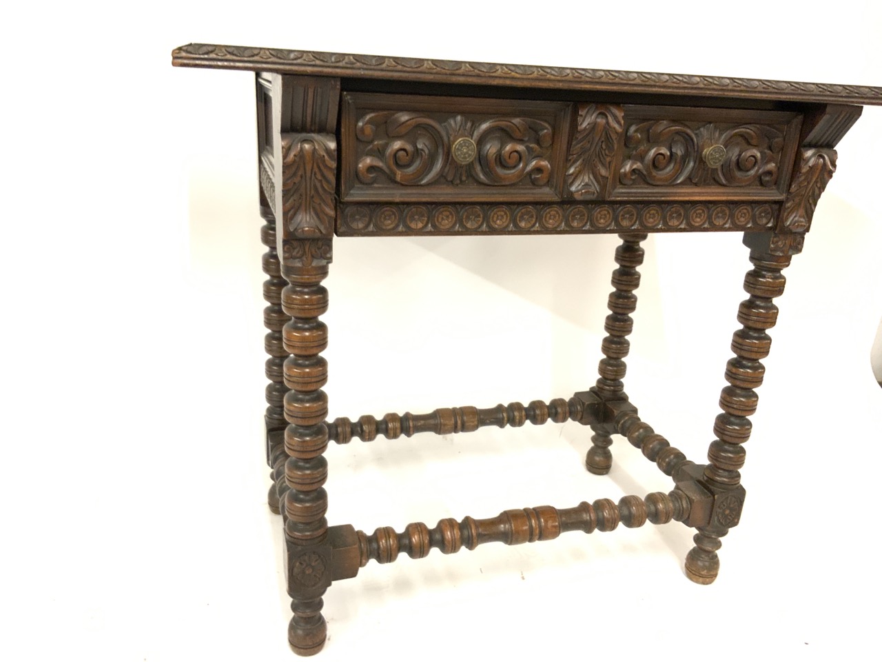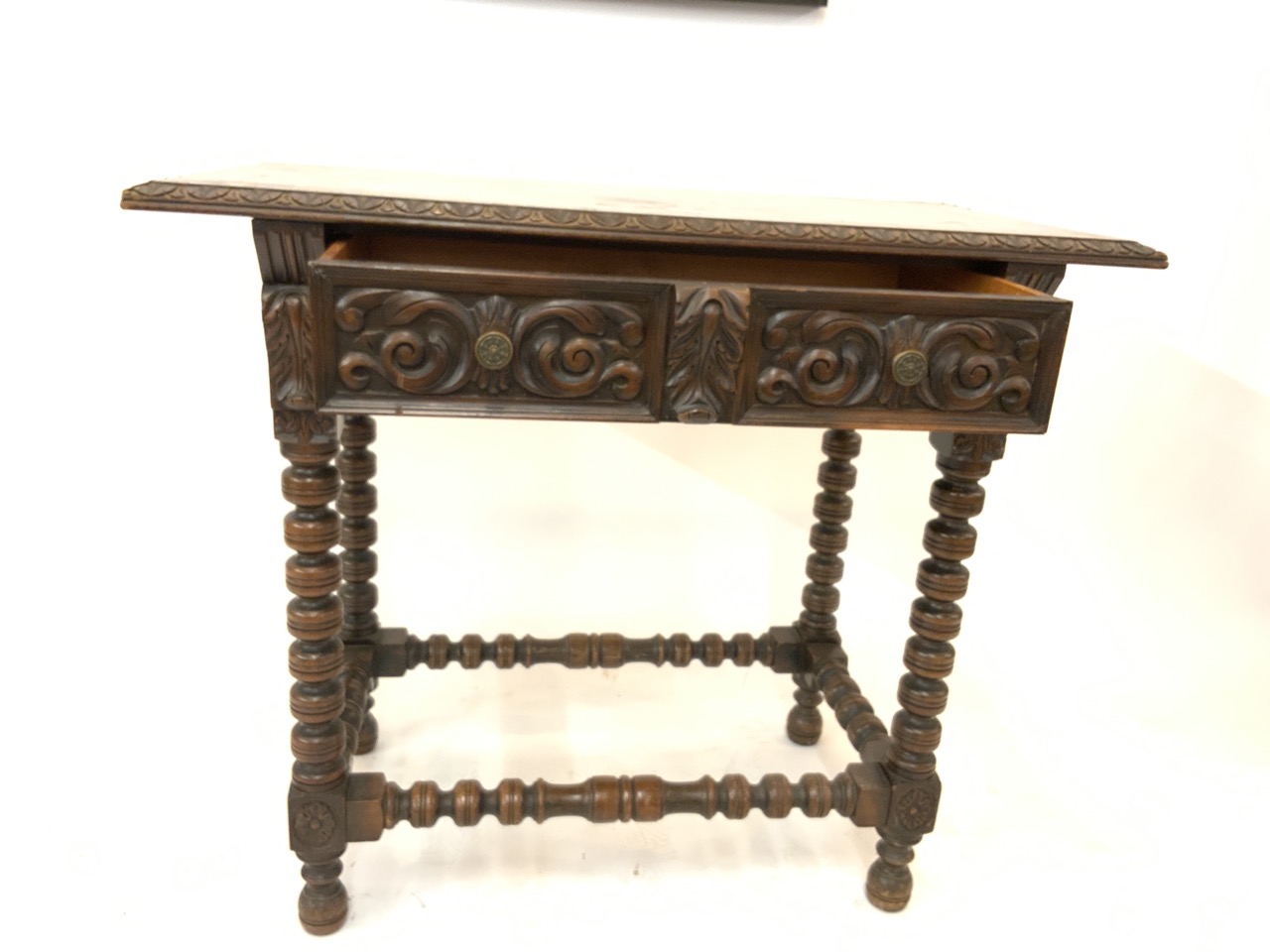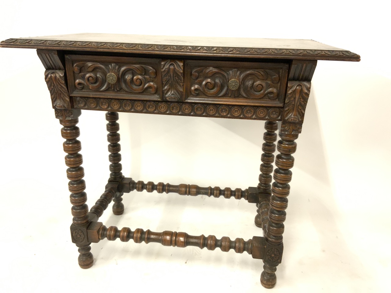 A fine dark walnut Jacobean style server or wine table. Ideal size. Carved walnut with marquetry banded inlay.