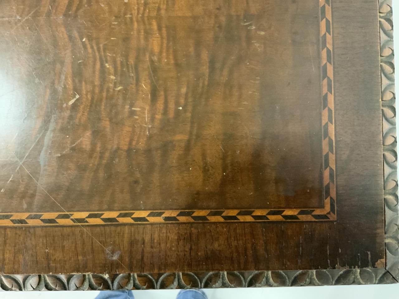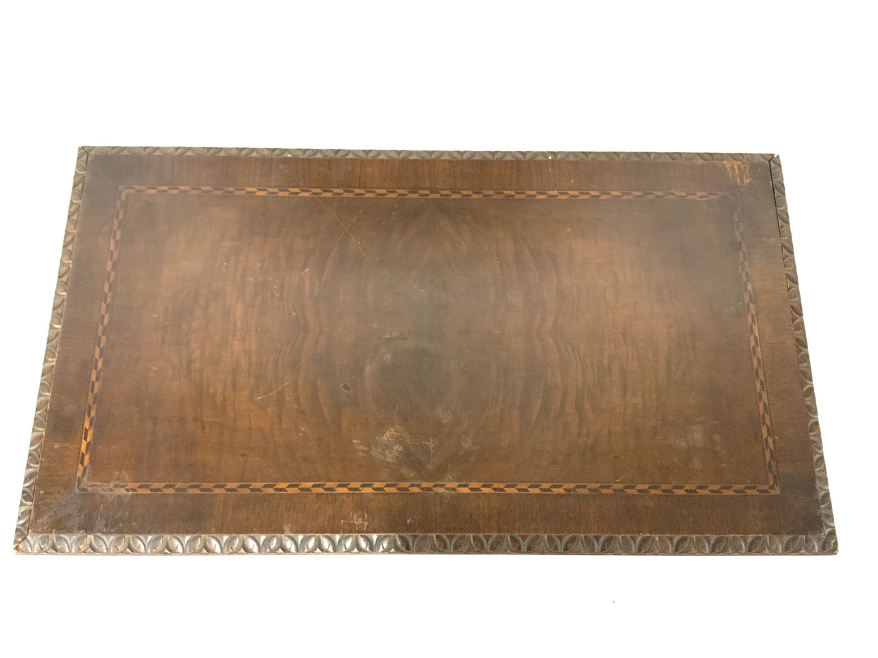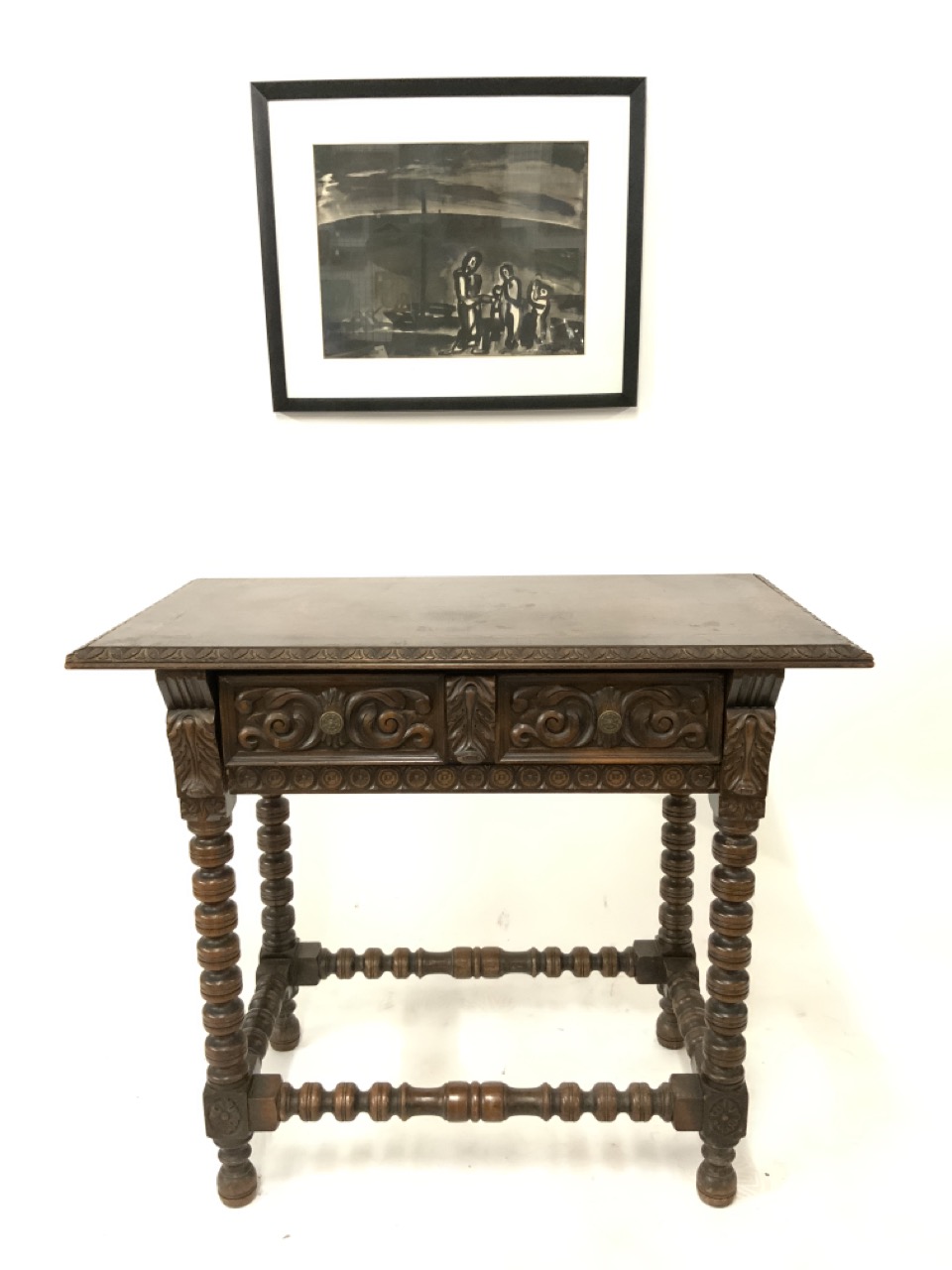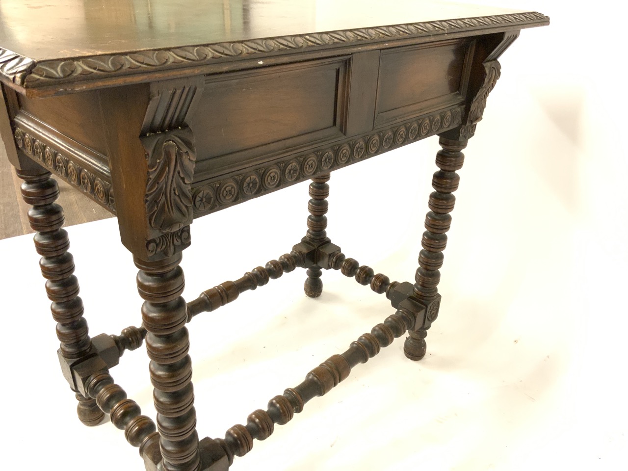 A fine dark walnut Jacobean style server or wine table. Ideal size. Carved walnut with marquetry banded inlay.