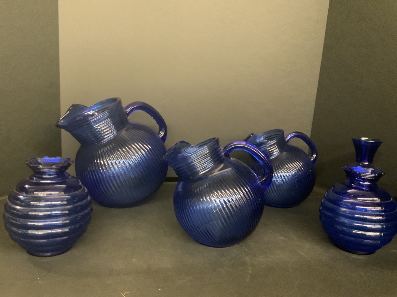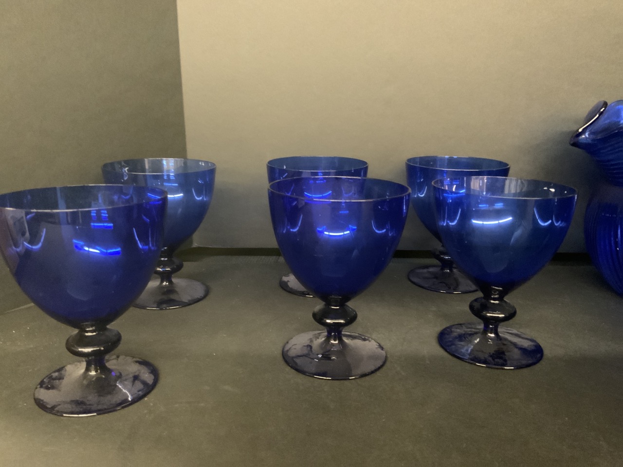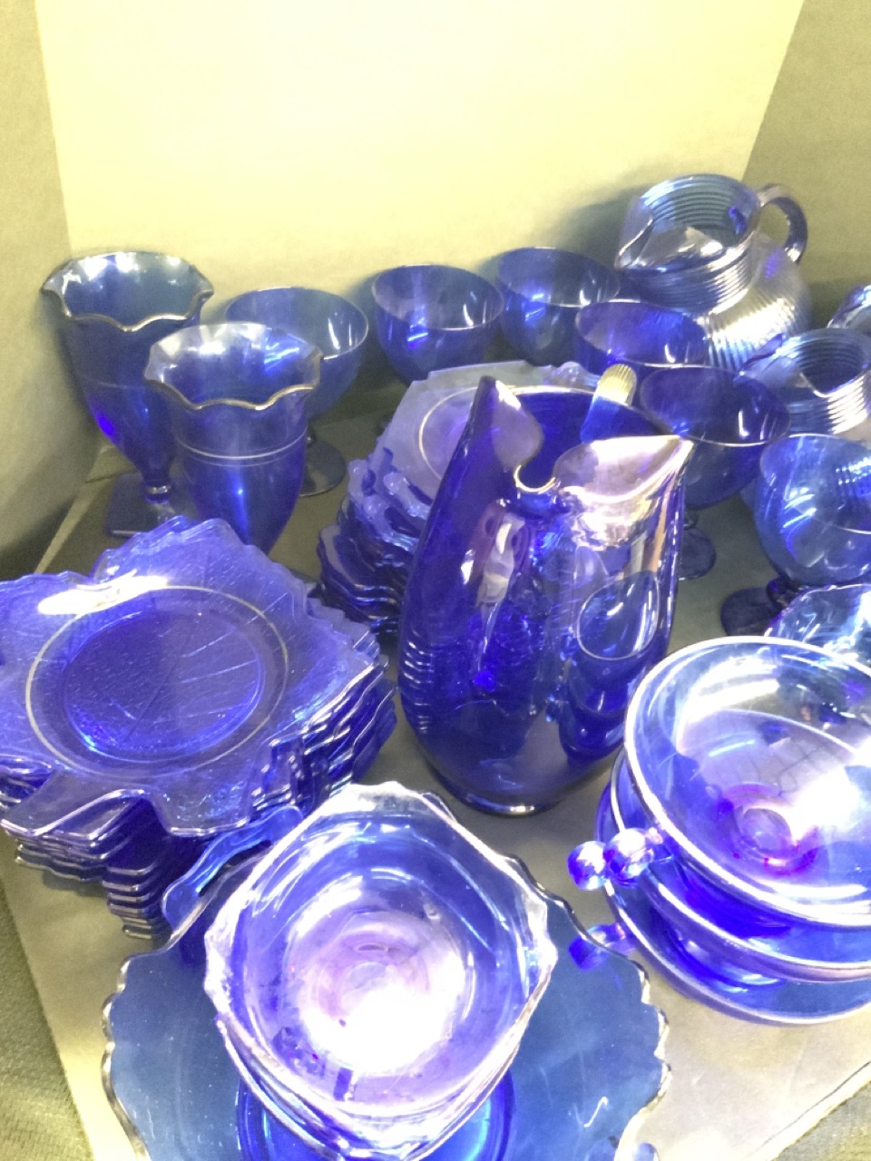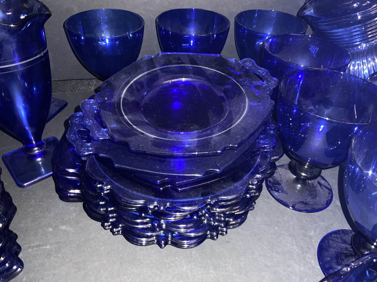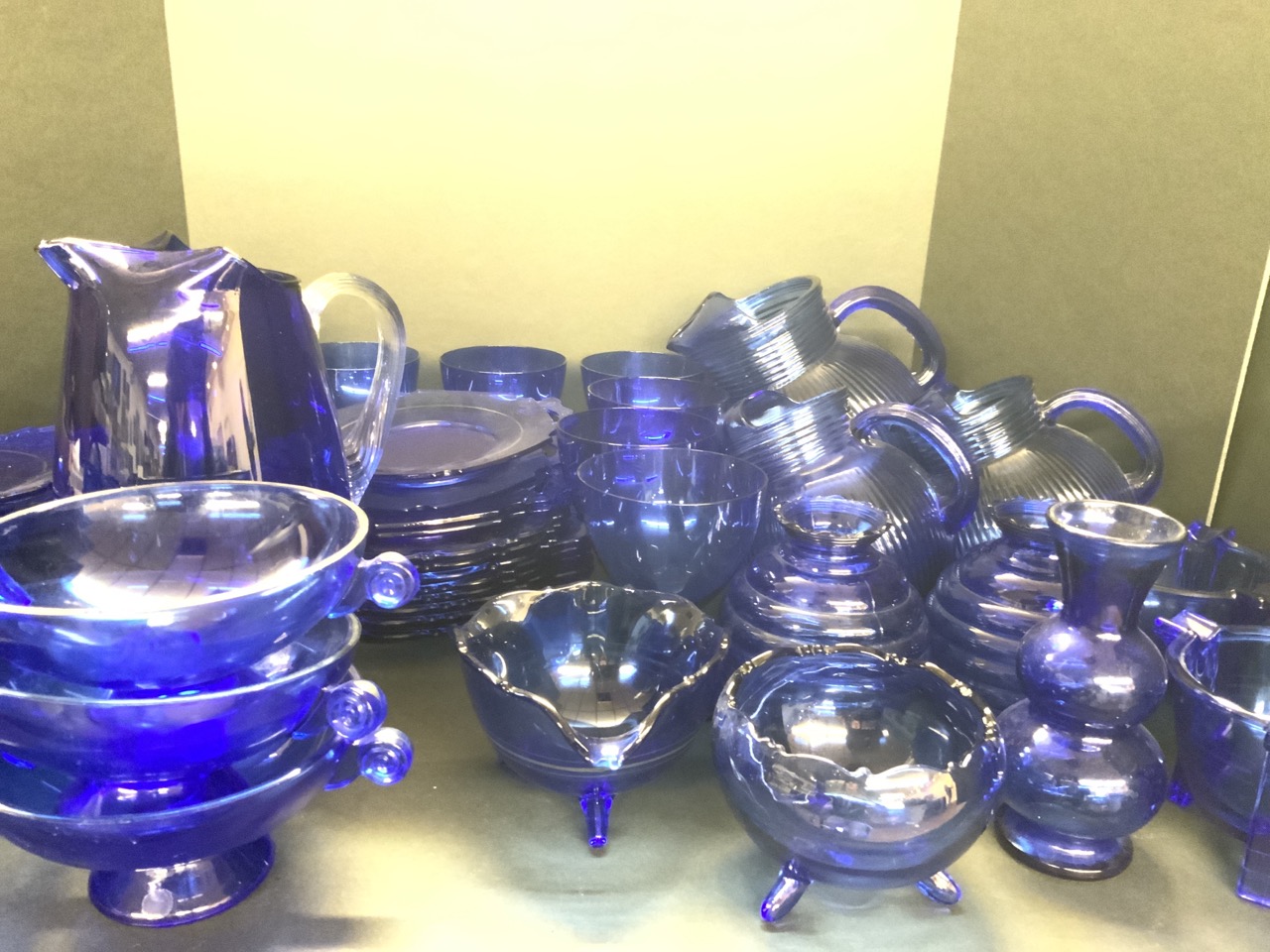 A large compiled grouping of depression cobalt blue glassware. As seen in photograph preview.