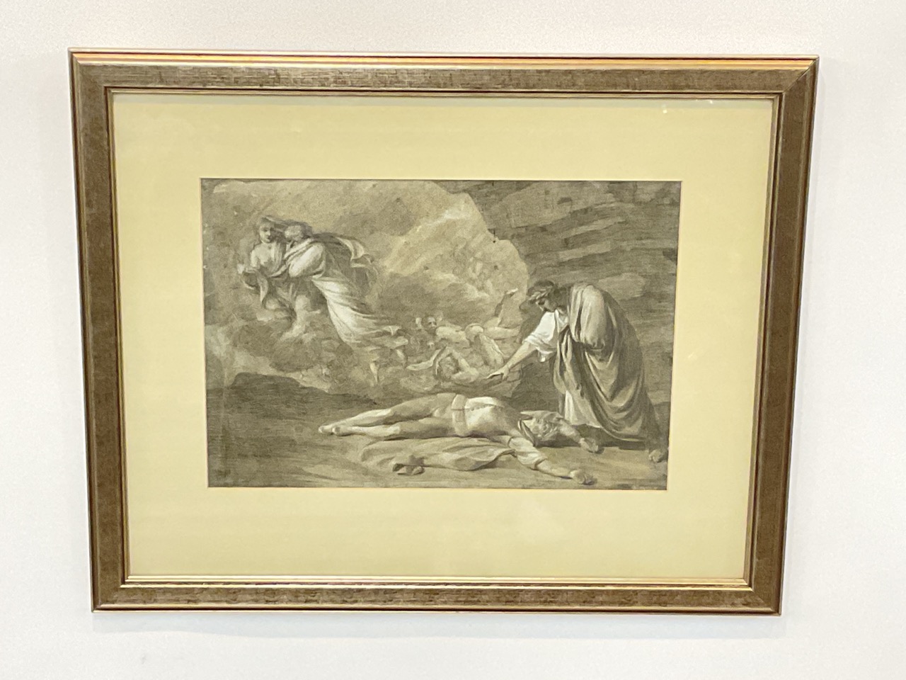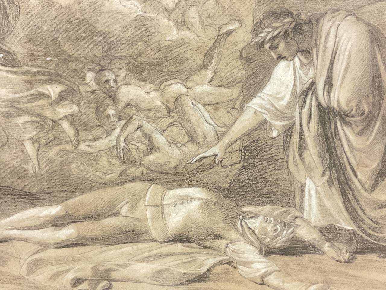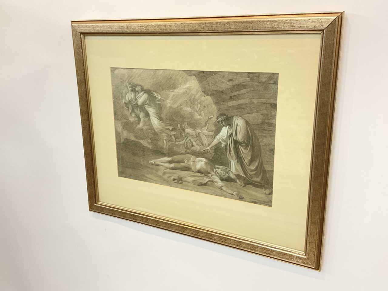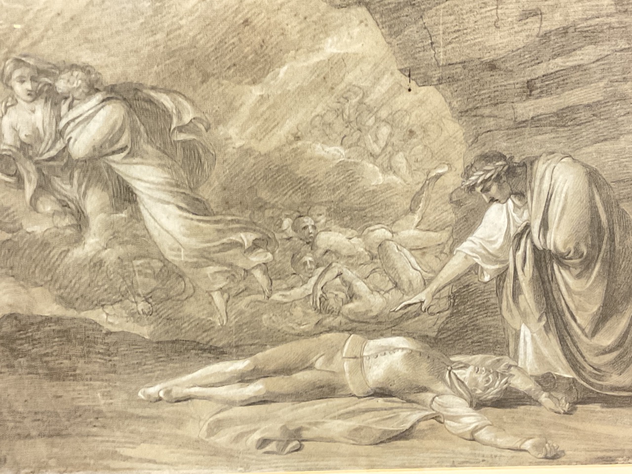 Dante and Virgil in hell surrounded by a group of suffering dead.