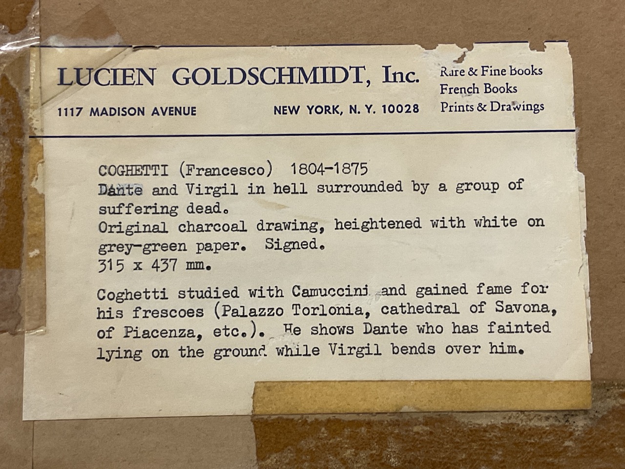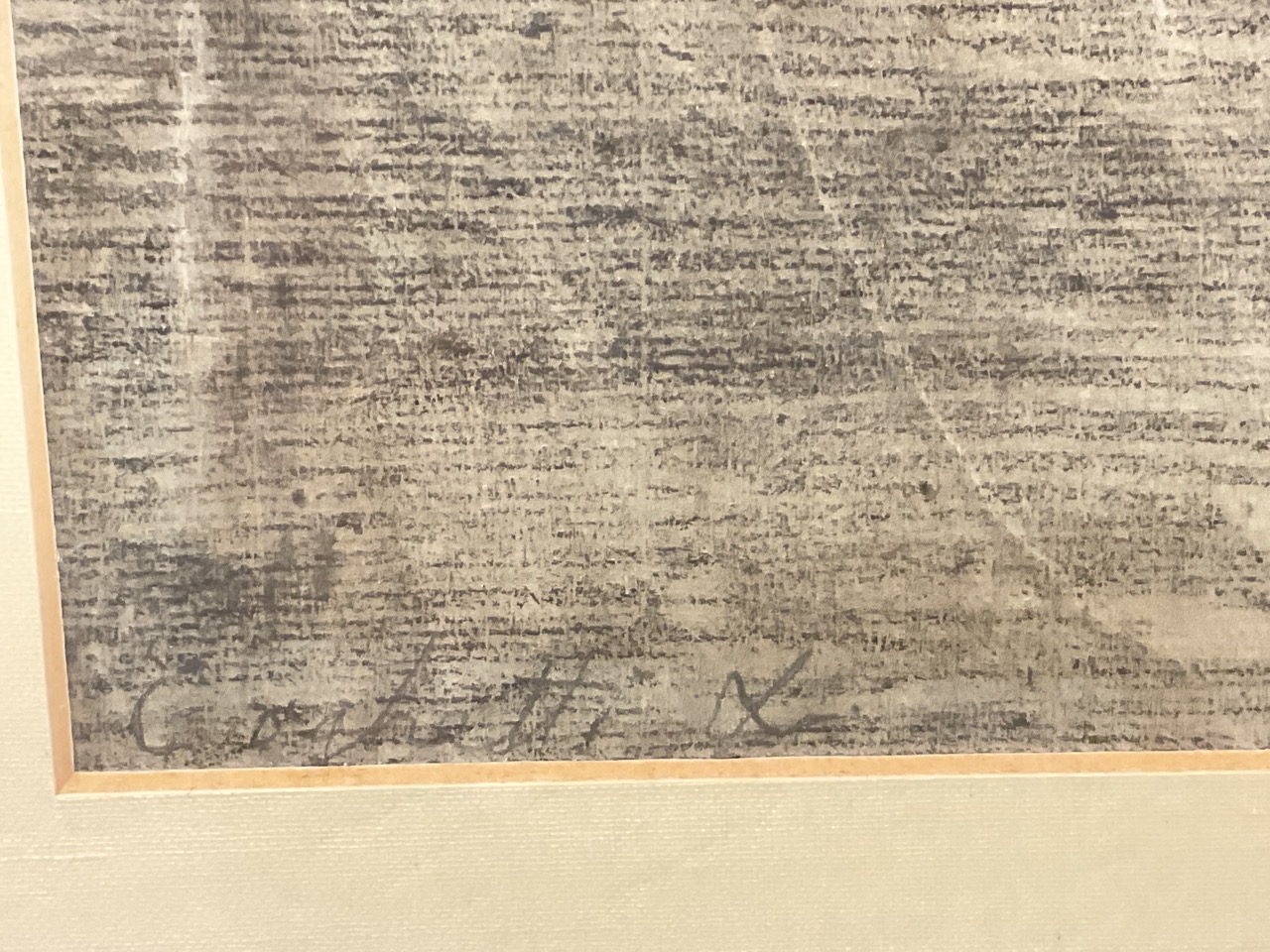 Original charcoal drawing, heightened with white on gray/green paper signs lower left
