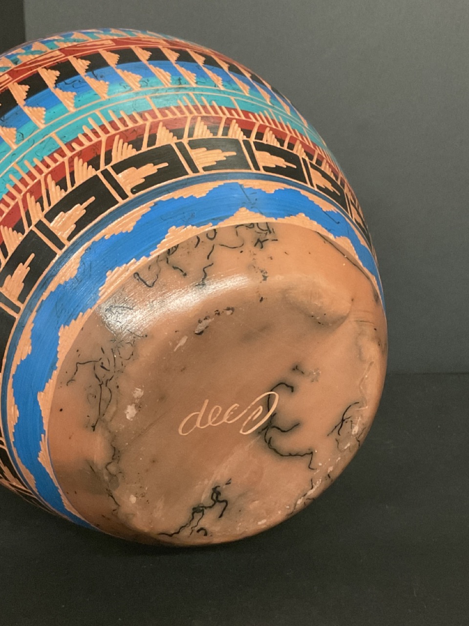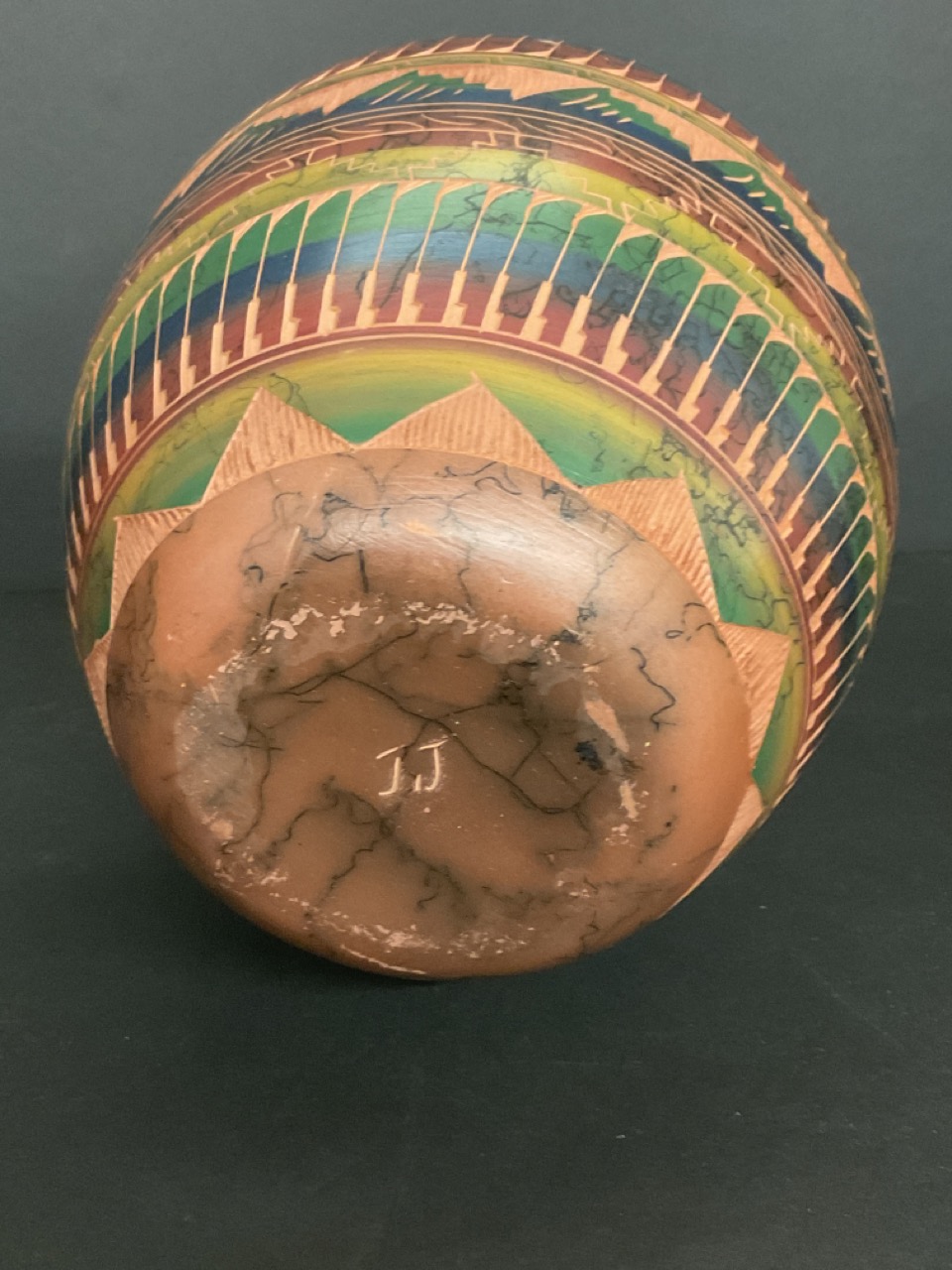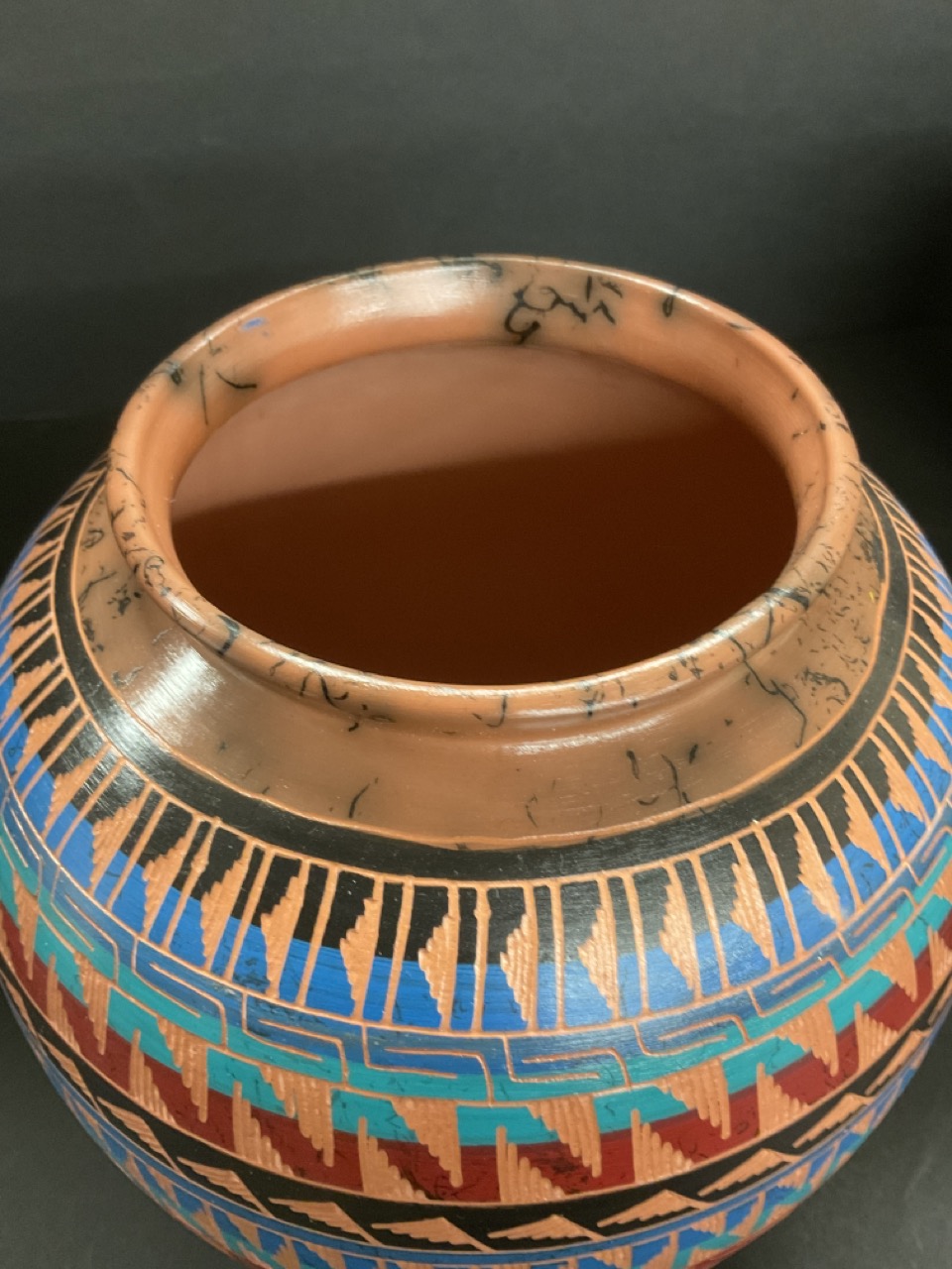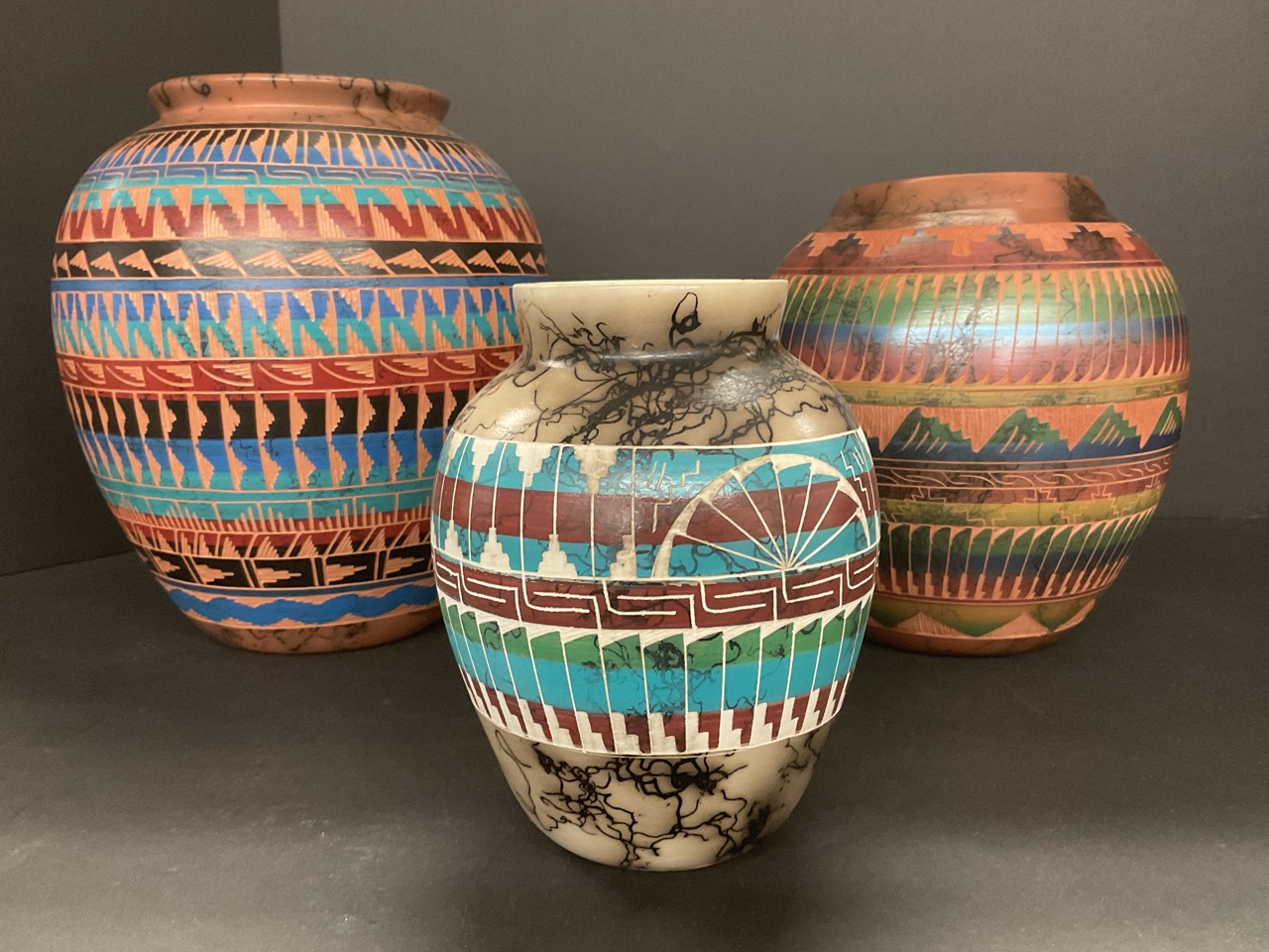 Three (3) Decorated Indian pottery pots. Signed at base.