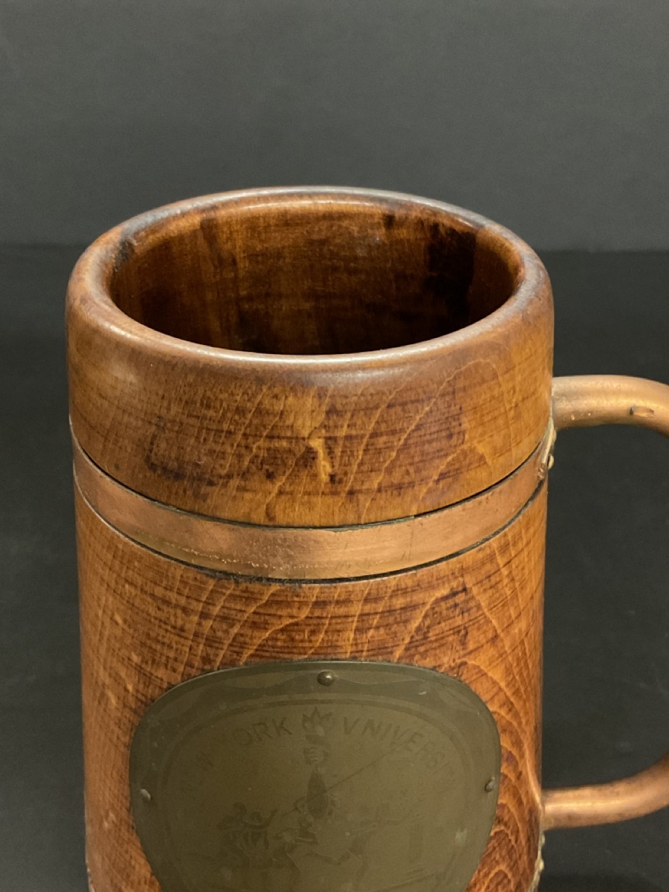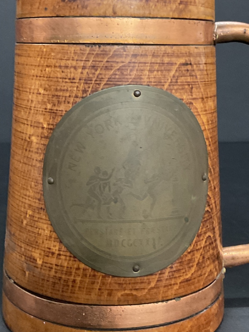 Rare New York University Oak and Copper Tankard. Arts and Crafts era with plaque reading "New York University Perstare Et Prestare MDCCCXXXI (1831).