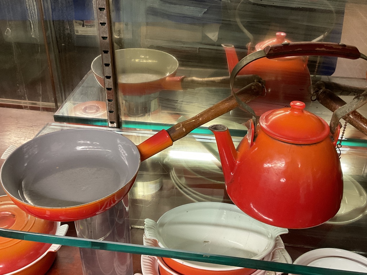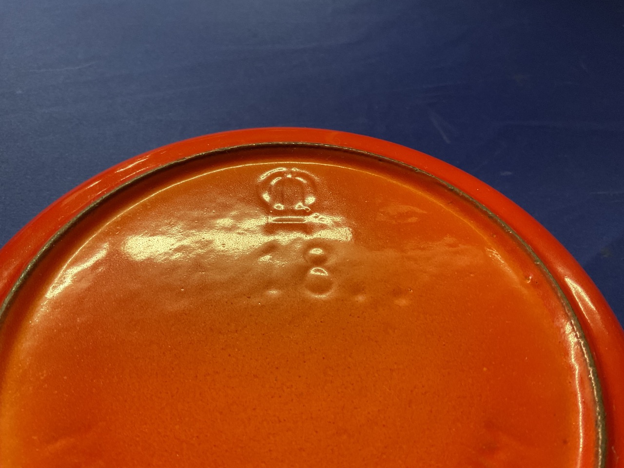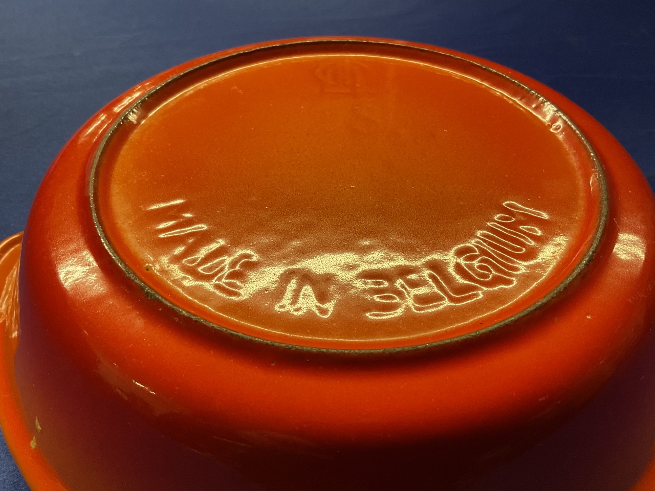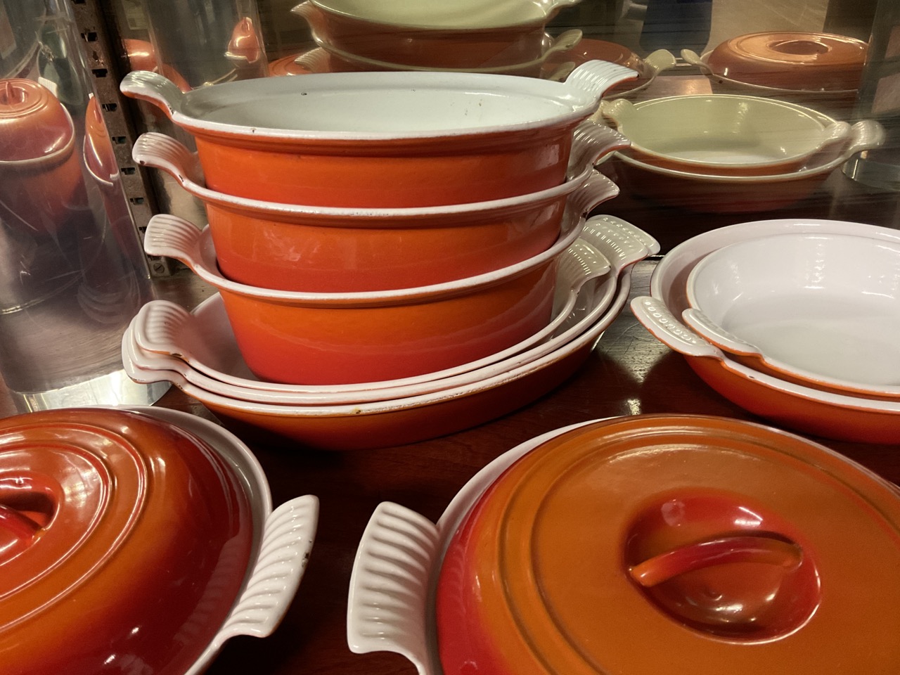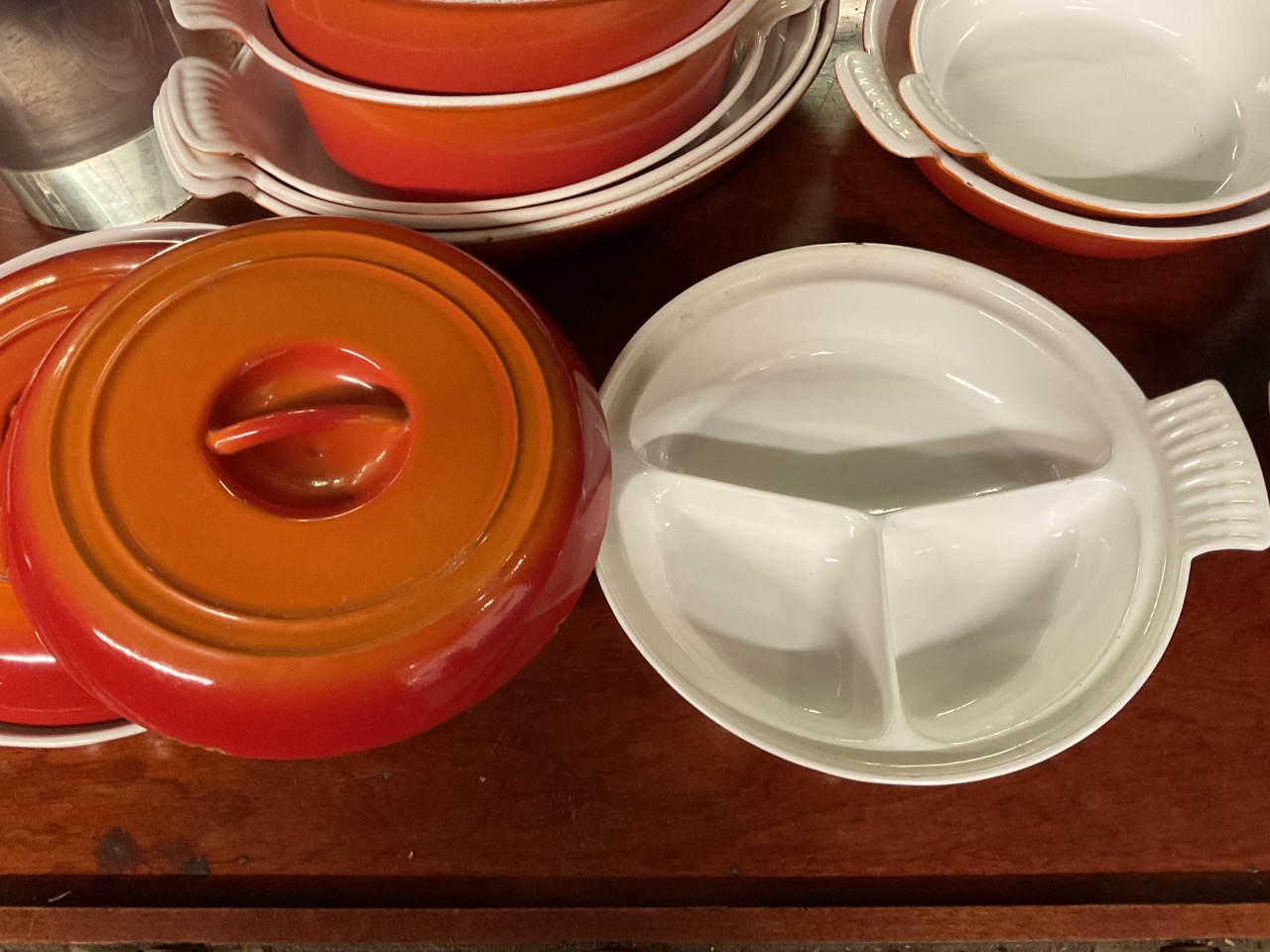 Belgium cookware lot 16 pieces. Cast iron enamel in orange. Overall good condition.