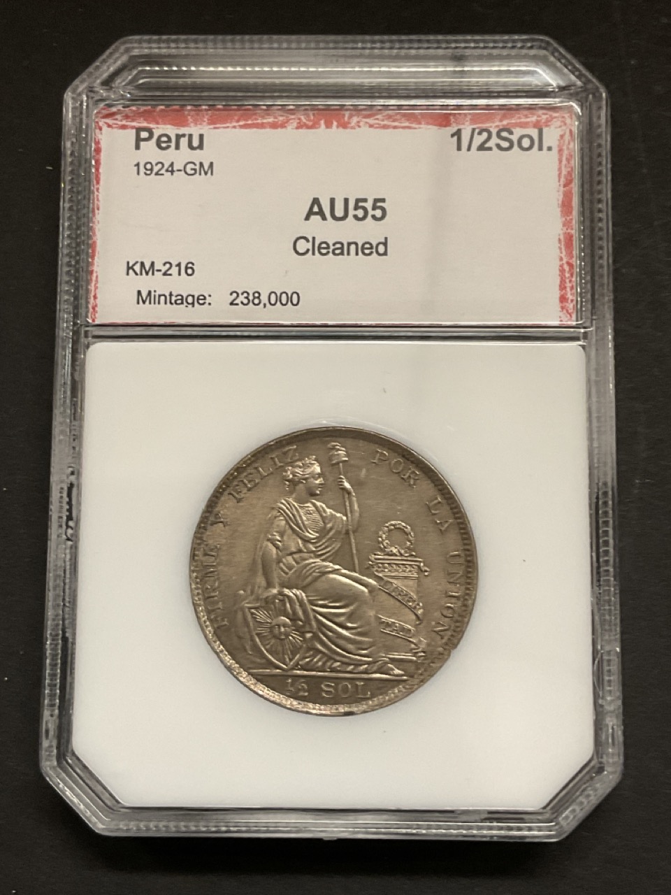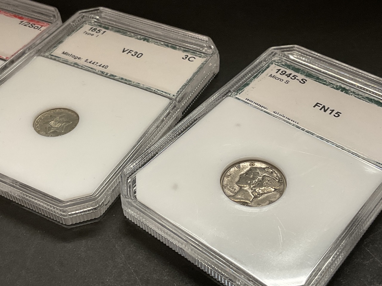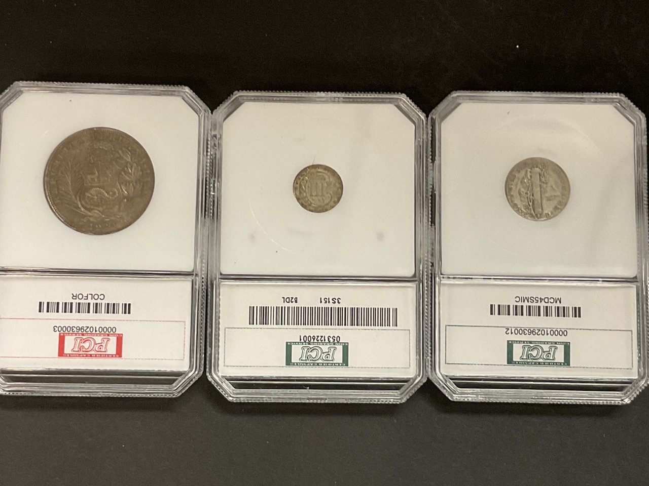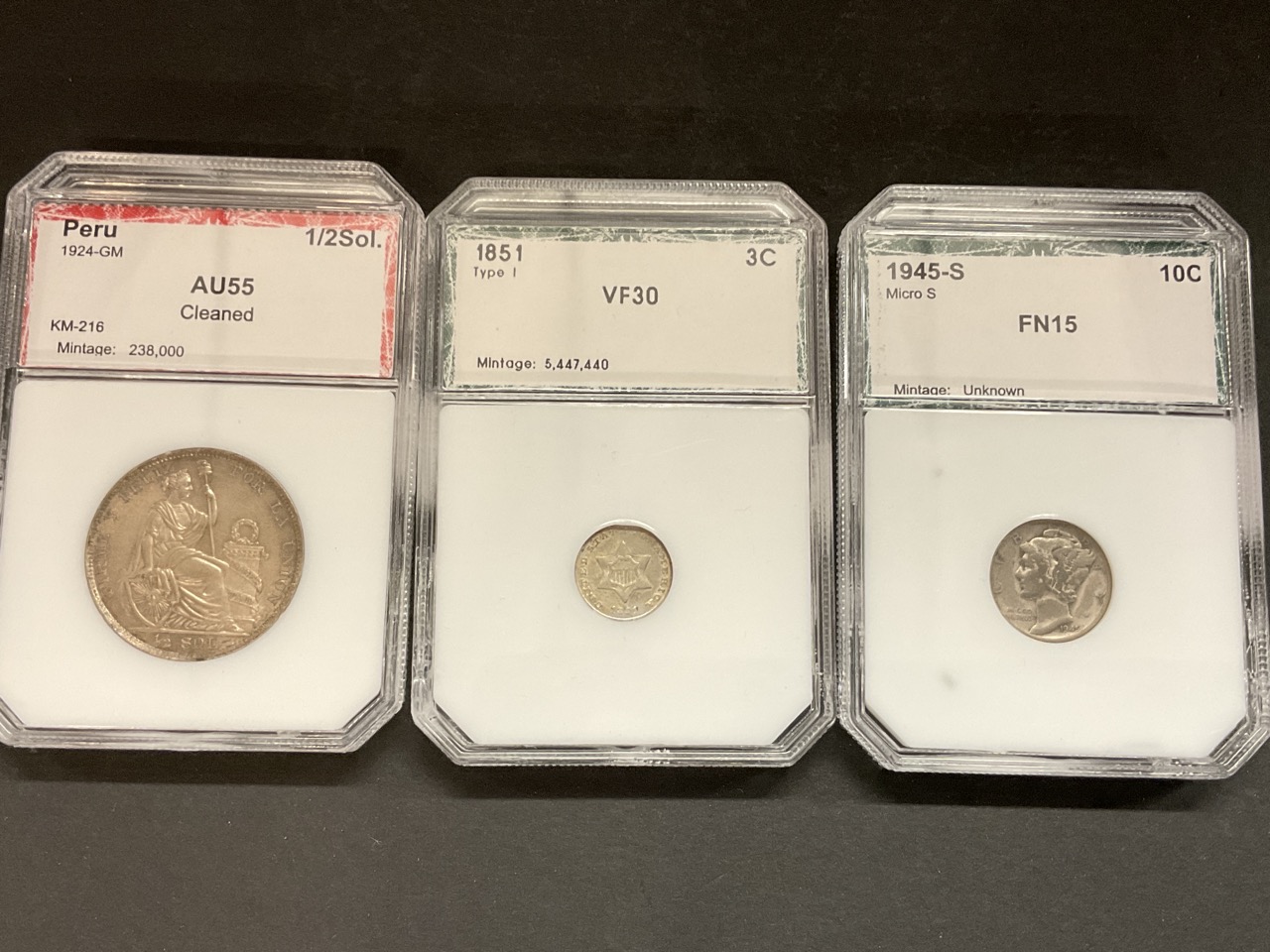 1924 Peru 1/2 SOL, 1945-S micros Mercury Dimes Fine 15, 1851 Type 1 3 Cent Silver very fine. All PCI Graded.