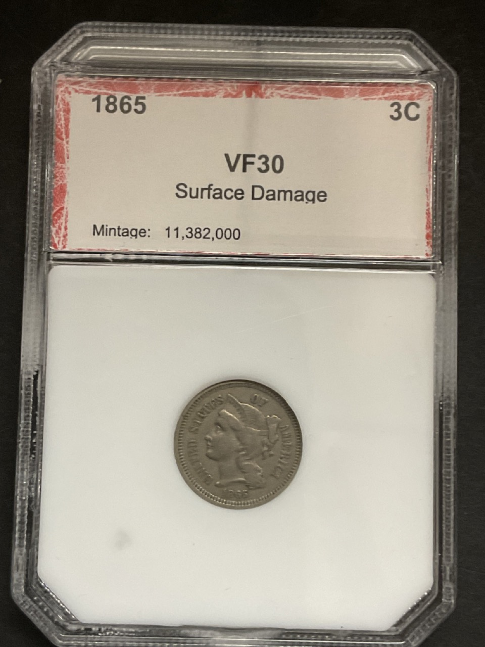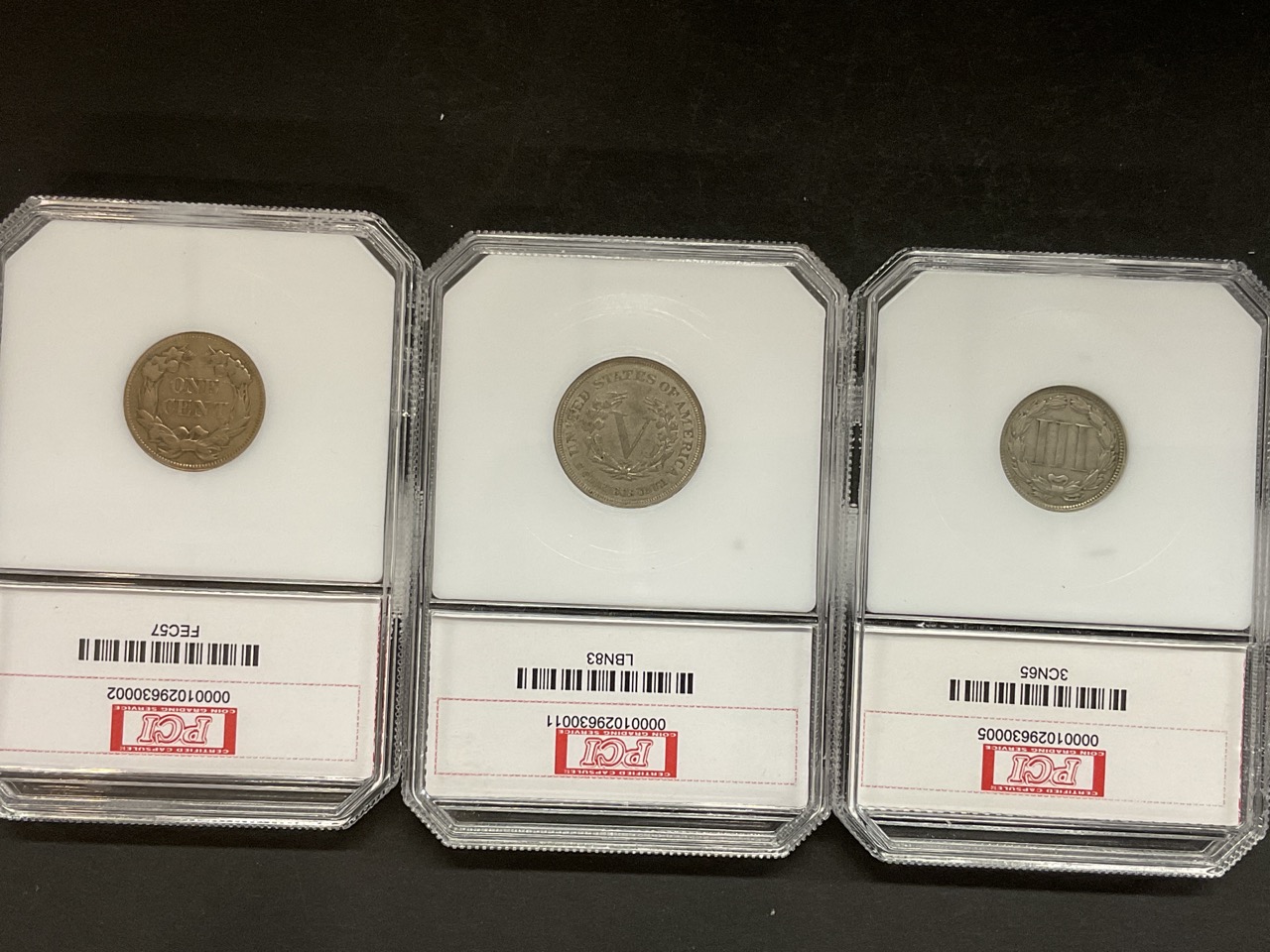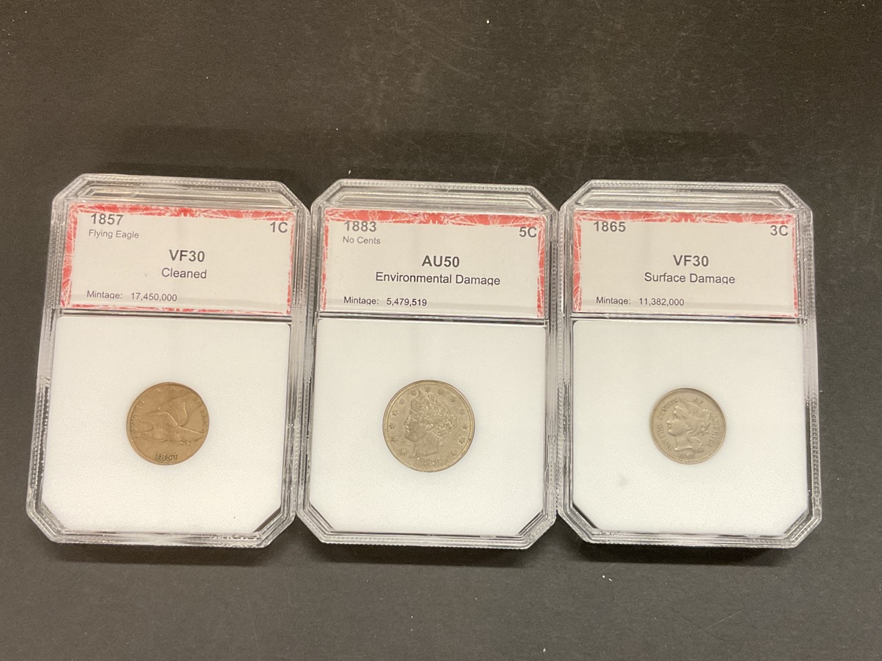 1857 Flying Eagle Cent VF 30 Cleaned, 1883 No Cents Nickel AU 50 Environmental Damage and 1865 3 Cent Nickel VF 30 Surface Damage
