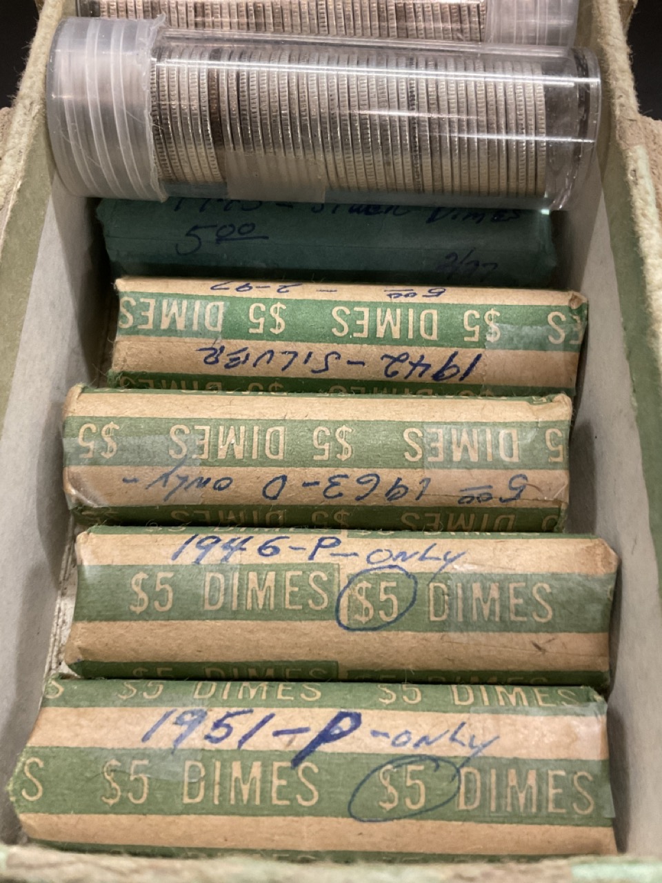 $100 Face Value U.S Silver Dimes including Mercury and Roosevelt housed in a mint/bank box. 90% silver.