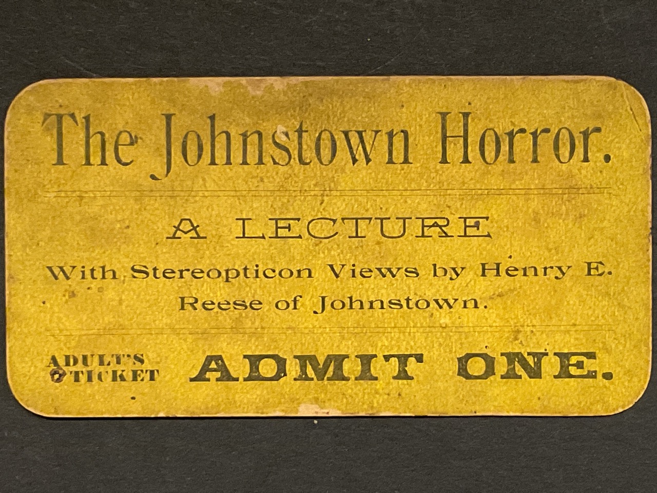 Titled: The Johnstown Horror, A Lecture with stereopticon views by Henry E. Reese of Johnstown. Adult Ticket Admit One.