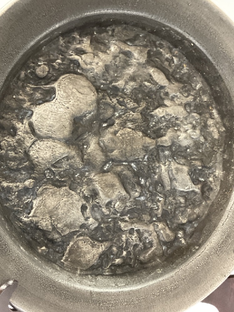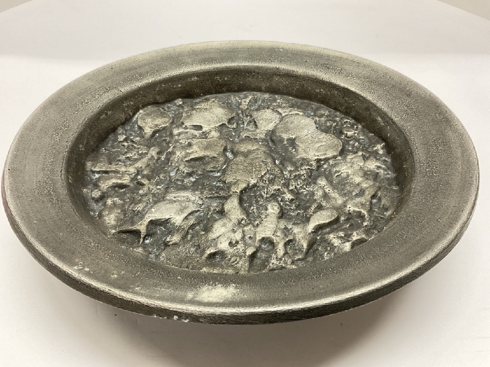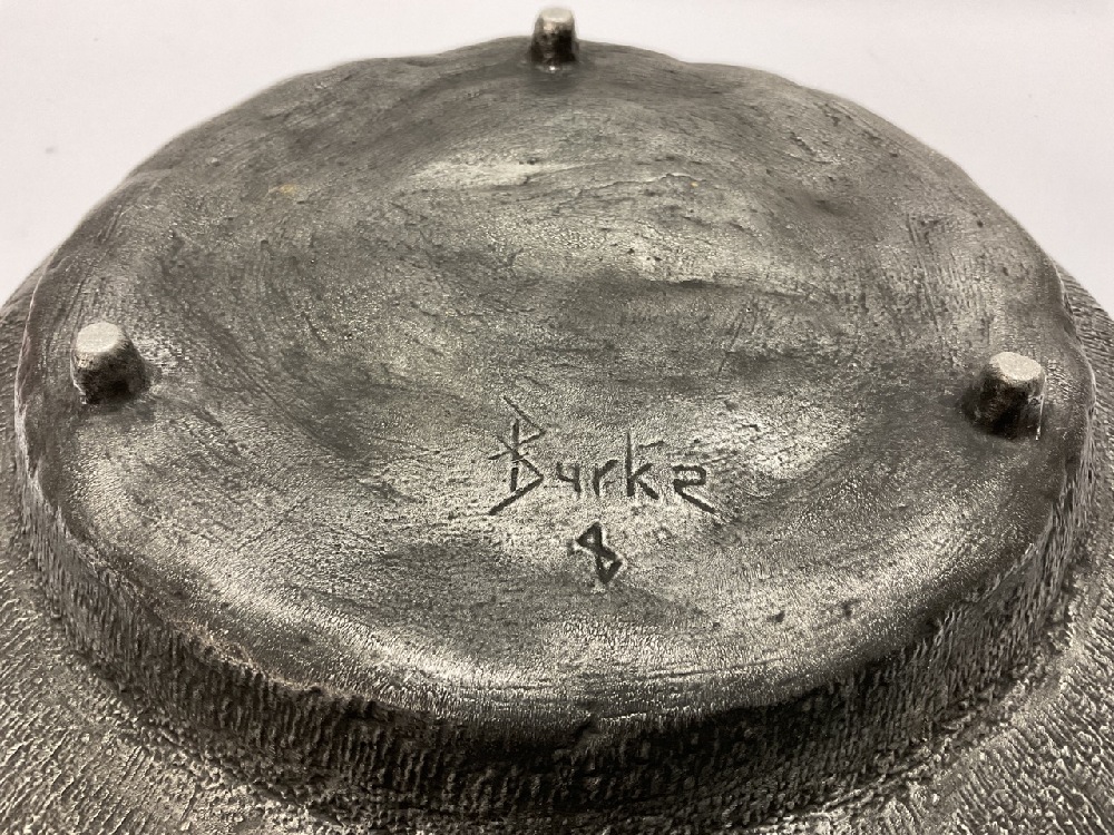 Brutalist Artisan Footed Tray. Pewter metal, signed Burke.