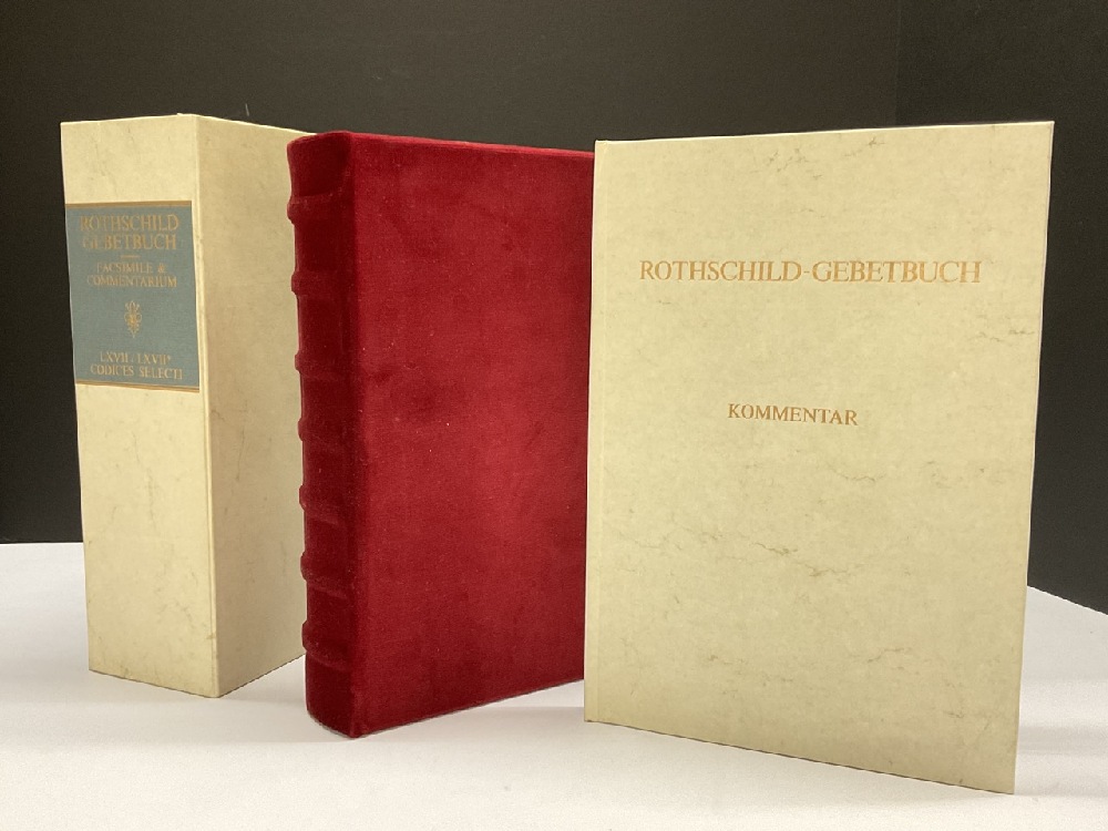 Rothschild-Gebetbuch. Codex Vindobonensis Series Nova 2844 der Österreichischen Nationalbibliothek. Mit zahlreichen Miniaturen, Bordüren u. Initialen in Gold und Farben. 2 Bde., Faksimile und Kommentar. Graz, Akademische Druck- und Verlagsanstalt, 1979. 8°. Roter OSamt und OPp. in OPp.-Schuber.