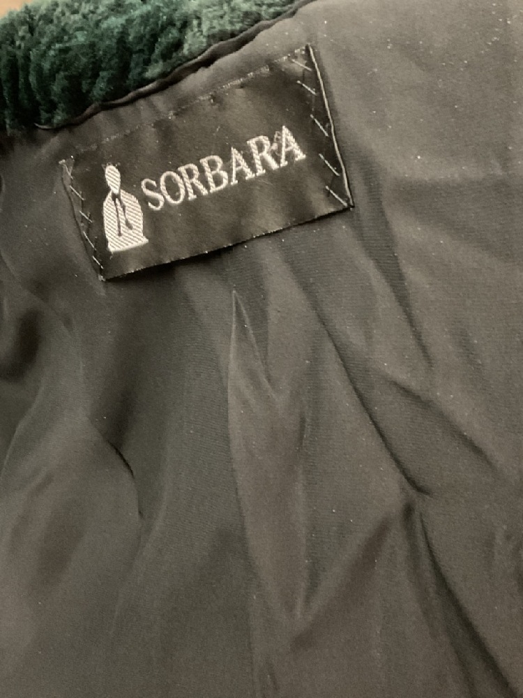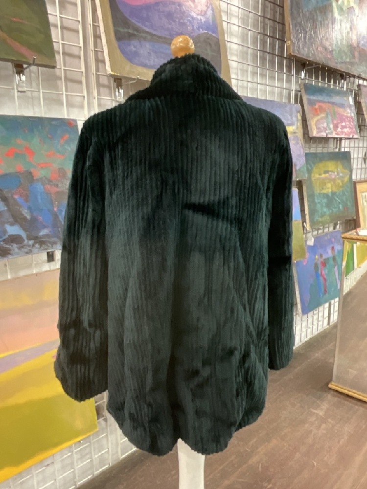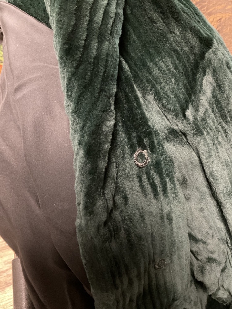 Jerry Sorbara Green Dyed Pieced Ranch Mink Coat. Very fine garment with silk lining. Size 10.