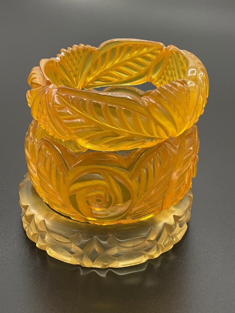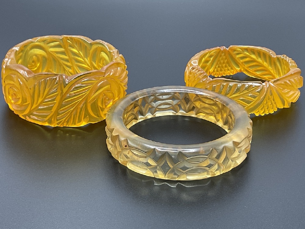 Three (3) Heavily carved vintage apple juice Bakelite bangle bracelets.