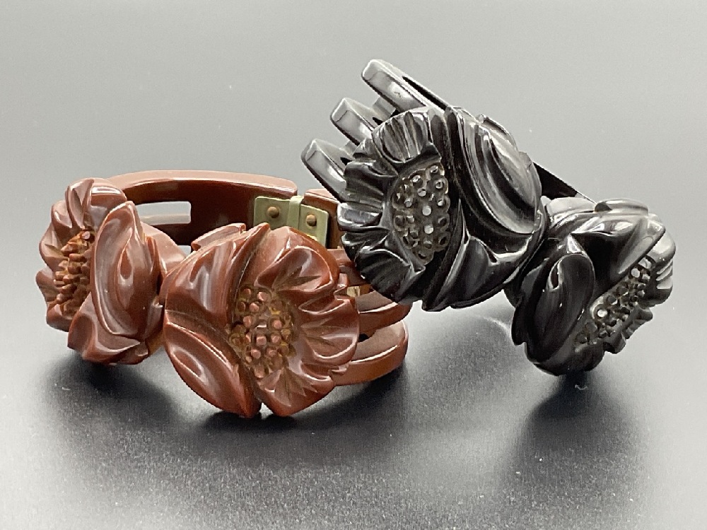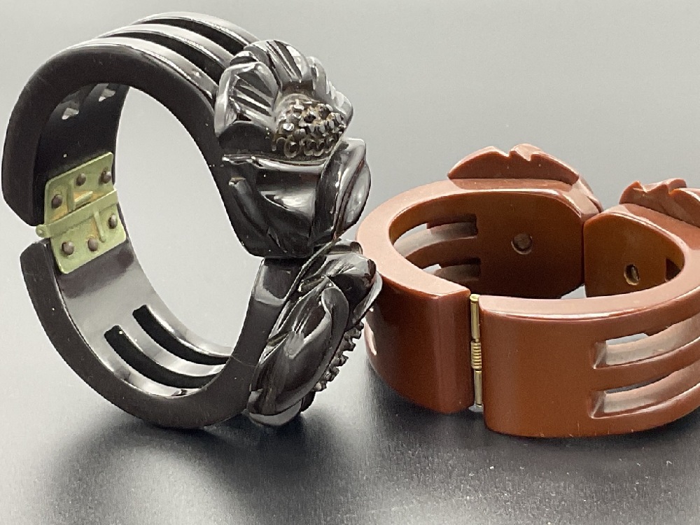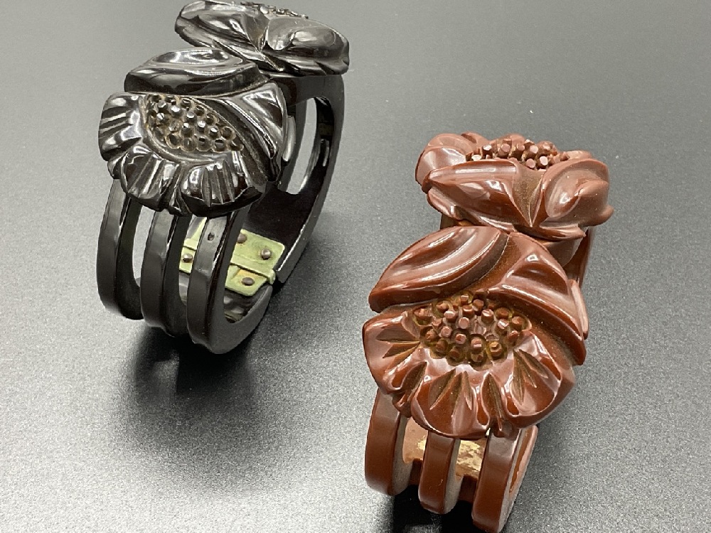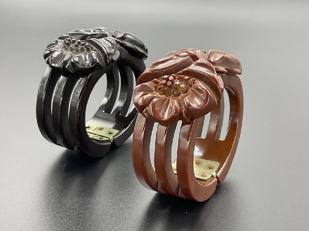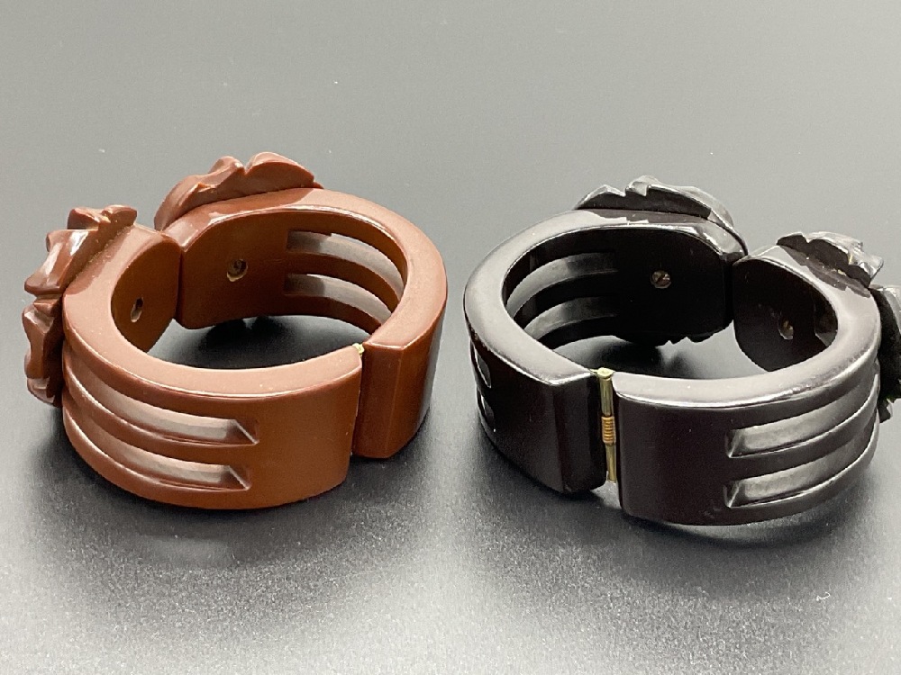 Two (2) carved Bakelite clamper bracelets. Rich dark brown and chocolate brown colors.