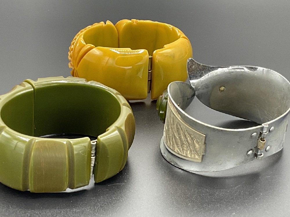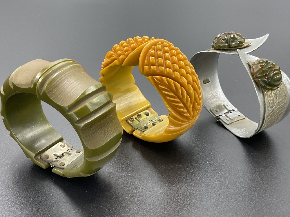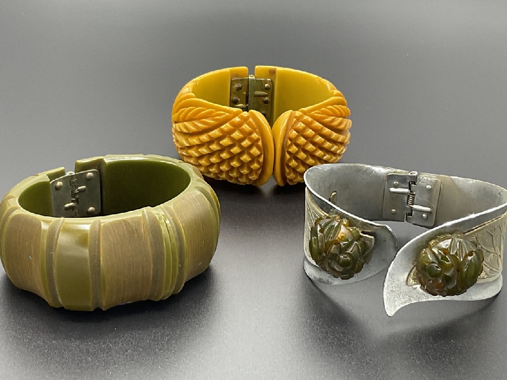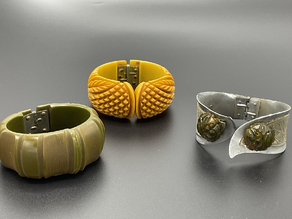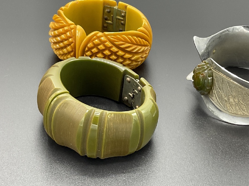 Three (3) Vintage Bakelite clamper bracelets. Heavily carved butterscotch, Art Deco white metal with affixed Bakelite and Green Artichoke carved clamper.