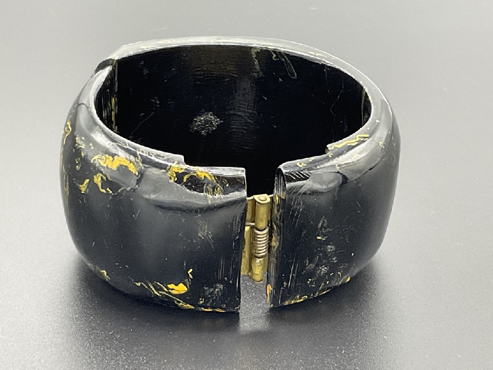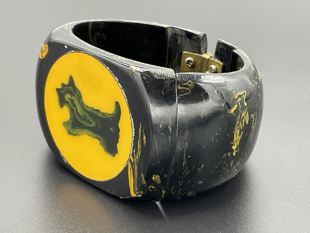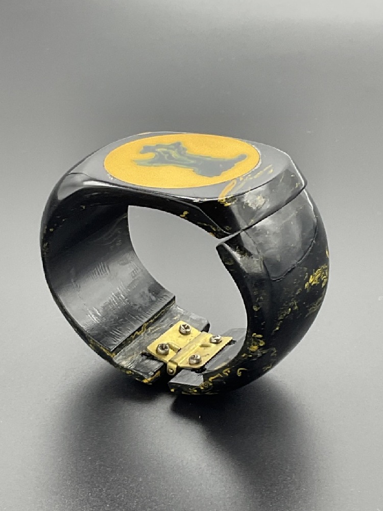 Vintage Bakelite Scotty dog clamper bracelet. Black marbled coloring.
