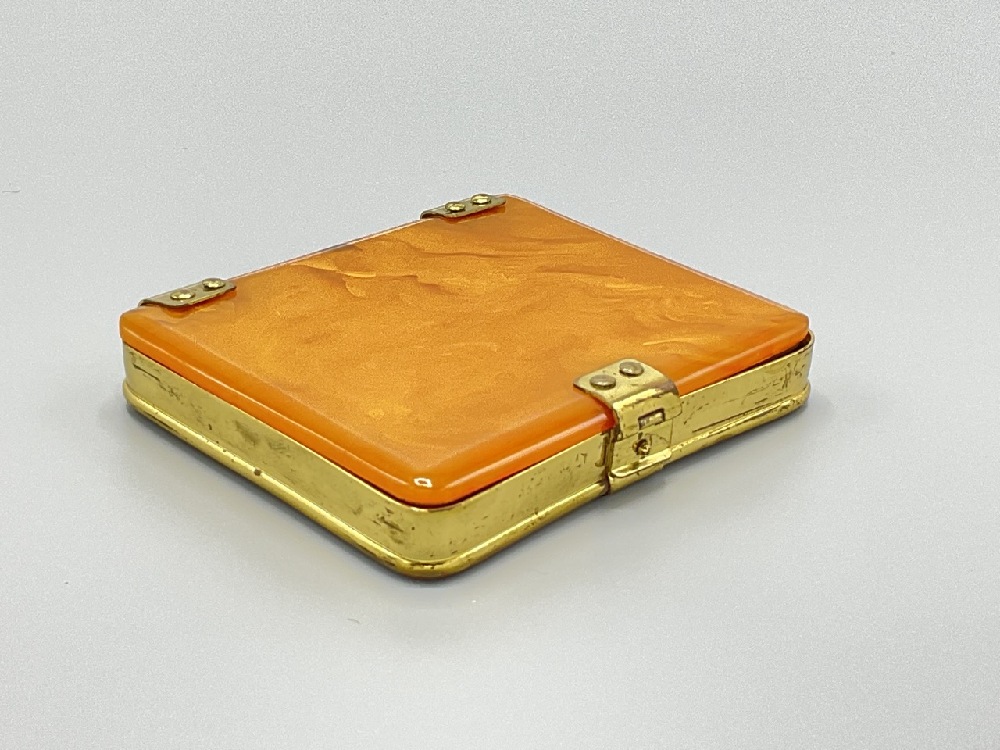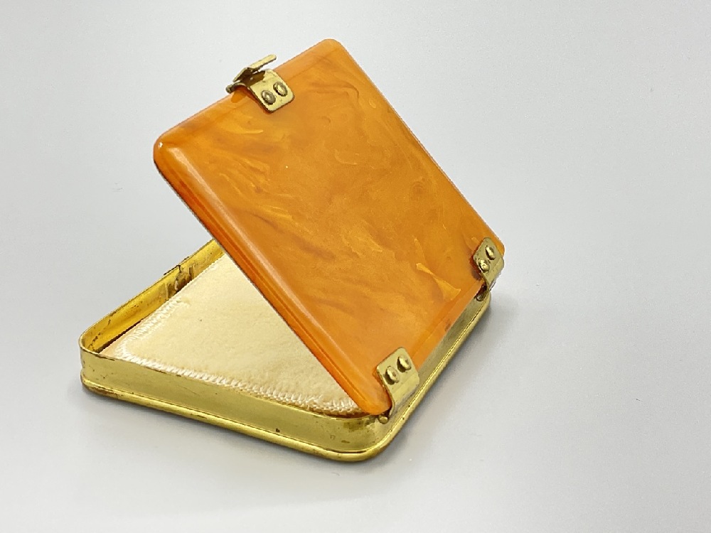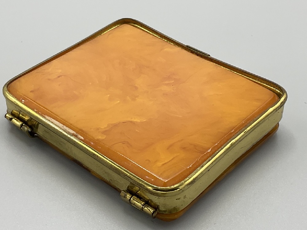 Honey Amber Bakelite powder compact with gold tone metal frame. Some wear to metal (scuffing). Original pad and mirror intact. Marked Pat appl. for.