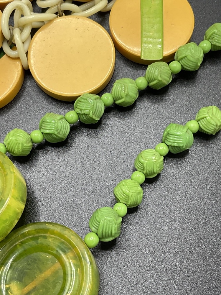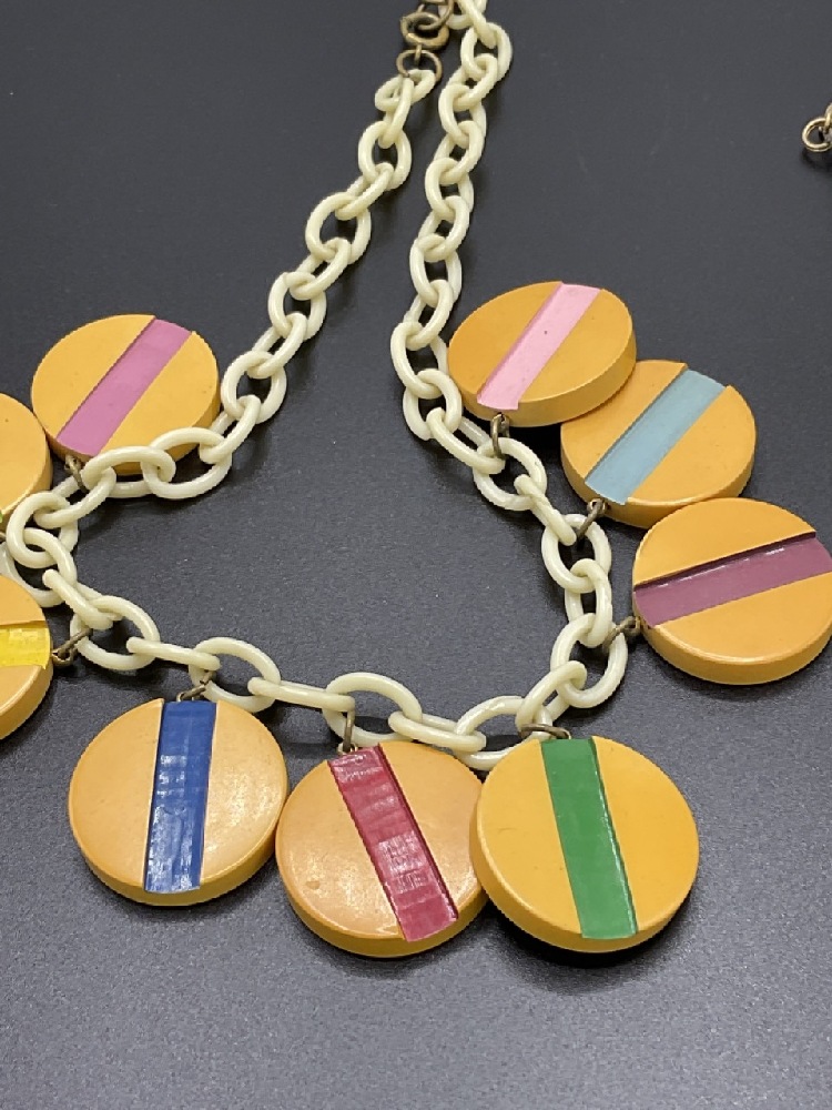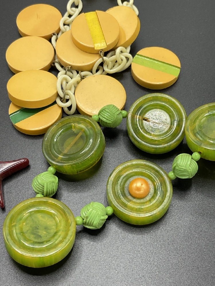 Three (3) Vintage Bakelite Necklaces. Cream spinach, multi-colored wreaths and striped discs.