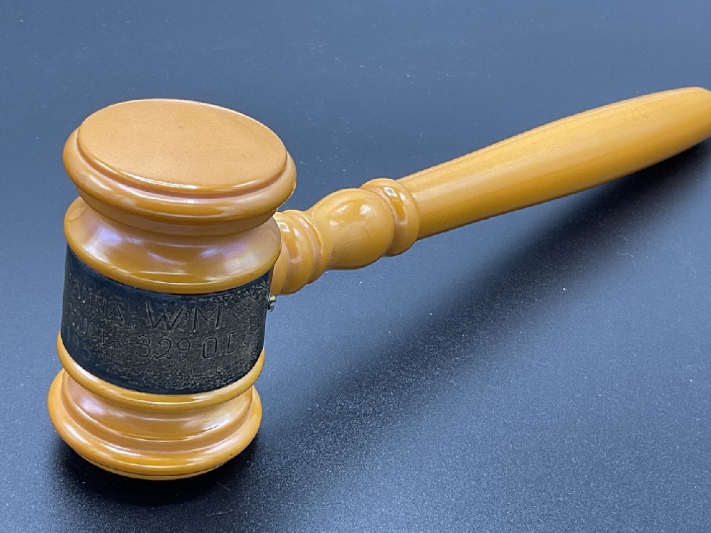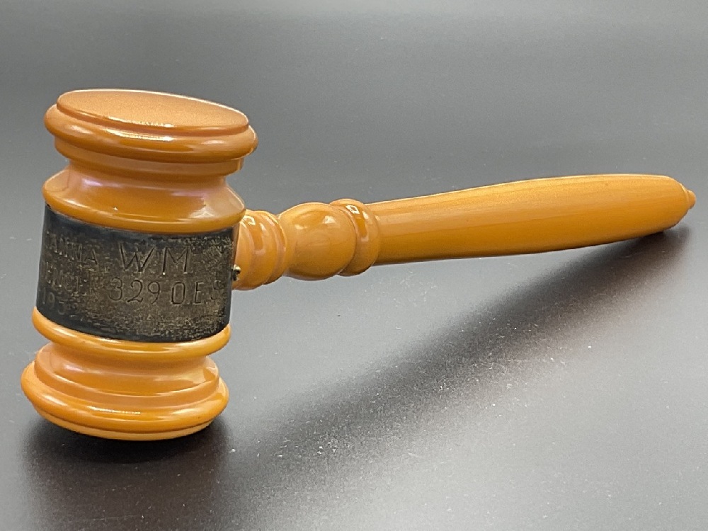A c. 1952 Vintage Butterscotch Bakelite Auctioneer or Judges Gavel. A sterling silver plaque reads " Georgeanna, WM Independence 329 O.E.S. 1952"