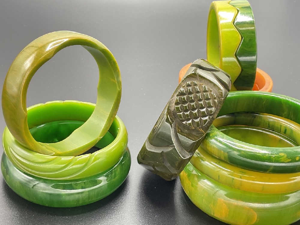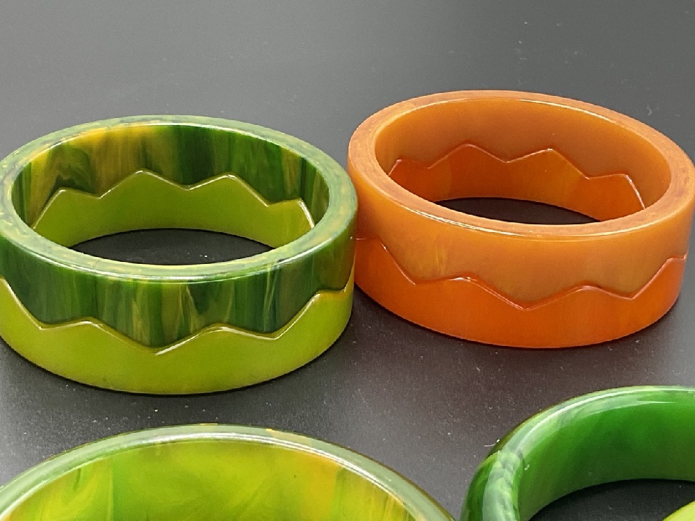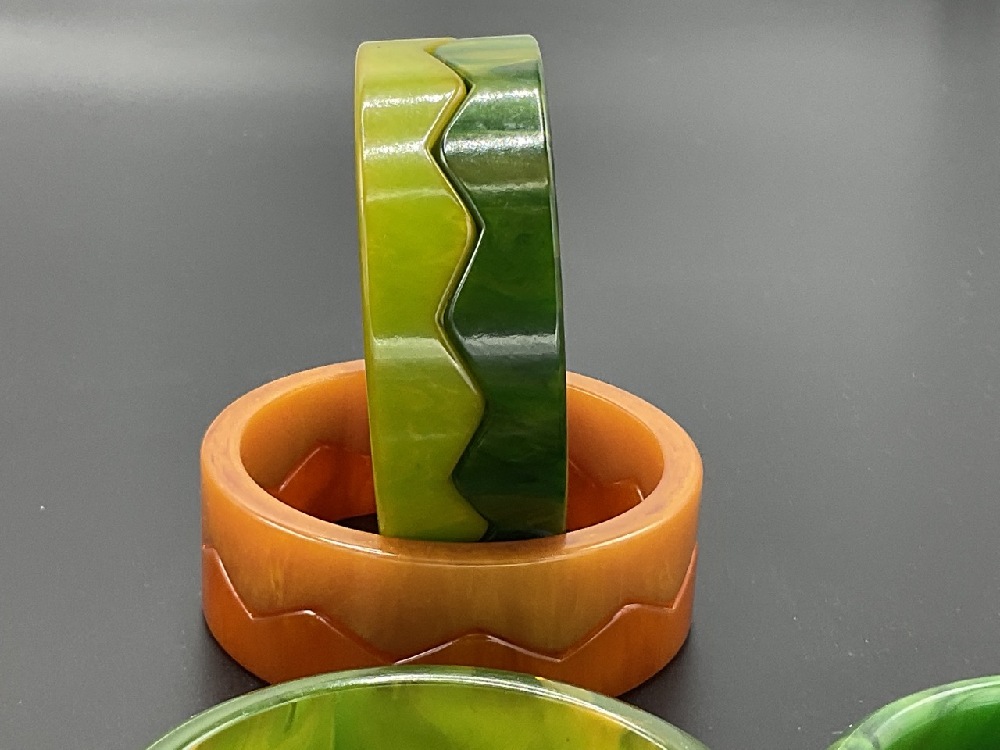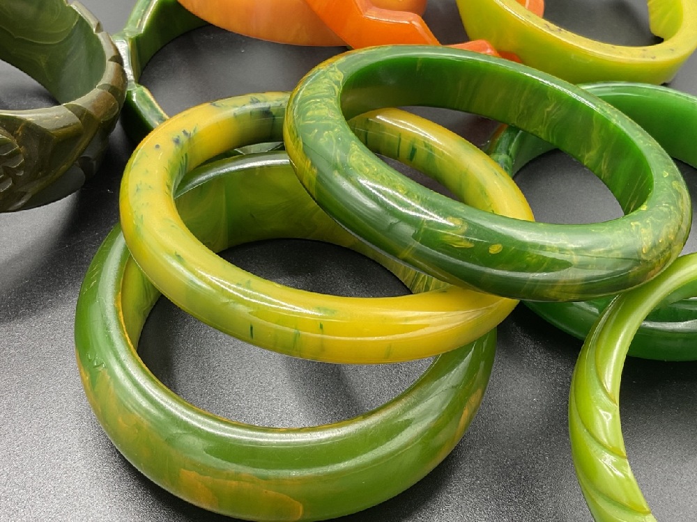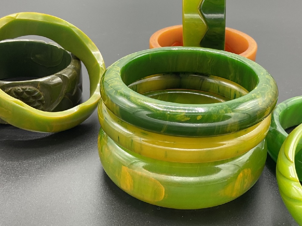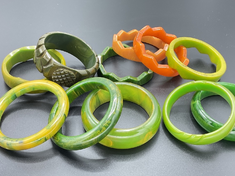 Eleven (11) Vintage Bakelite bangle bracelets. Green marbled, stacking orange and green, olive green etc. As seen in photograph preview.