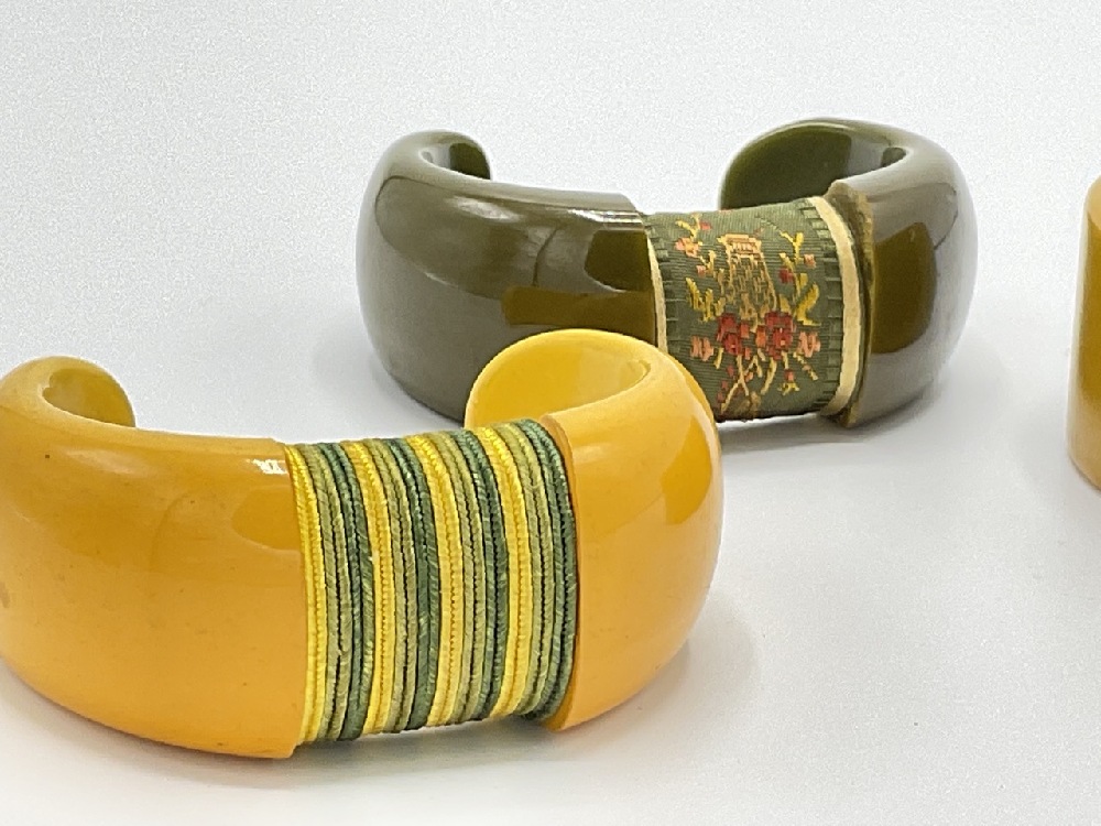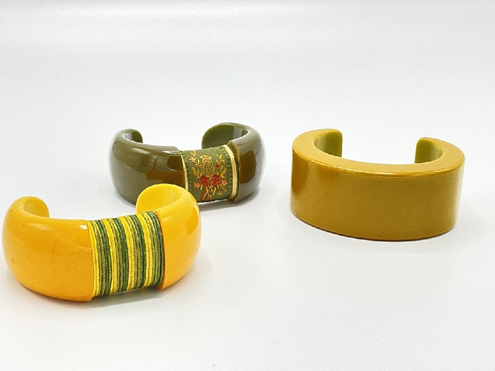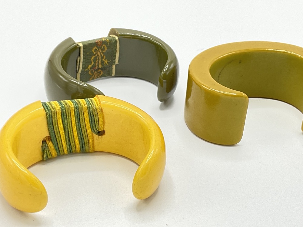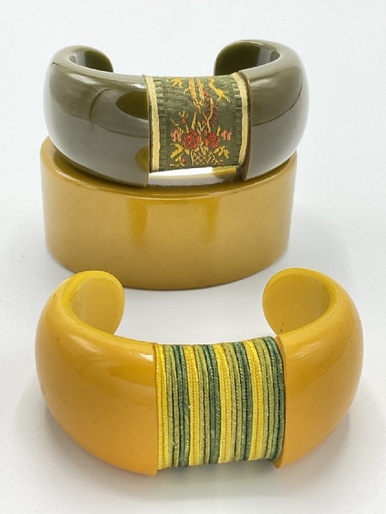 Three vintage Bakelite cuff bracelets. Two having fabric accents.