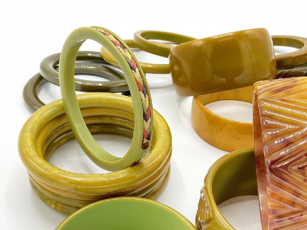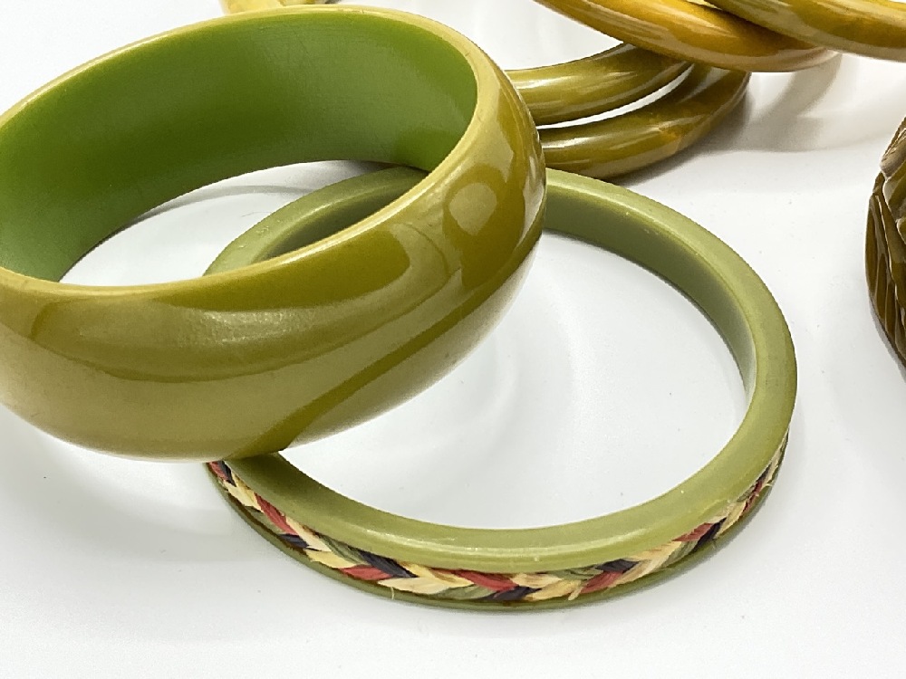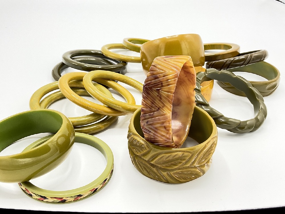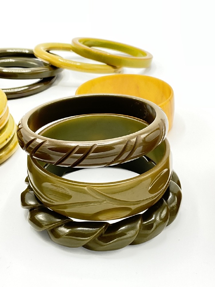 Eighteen (18) Assorted Bakelite bangle bracelets. Olive green, dark green, marbled etc. Carved, stacking and matching sets as seen in photograph preview.