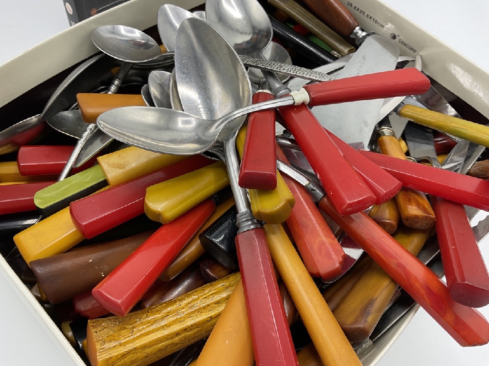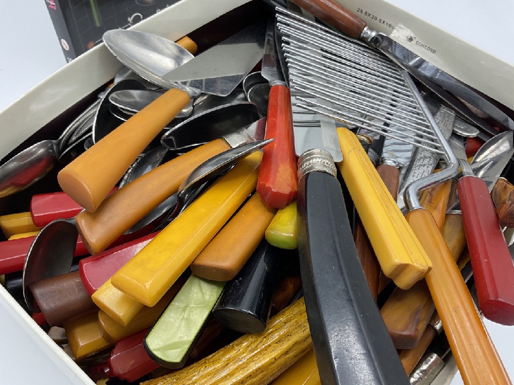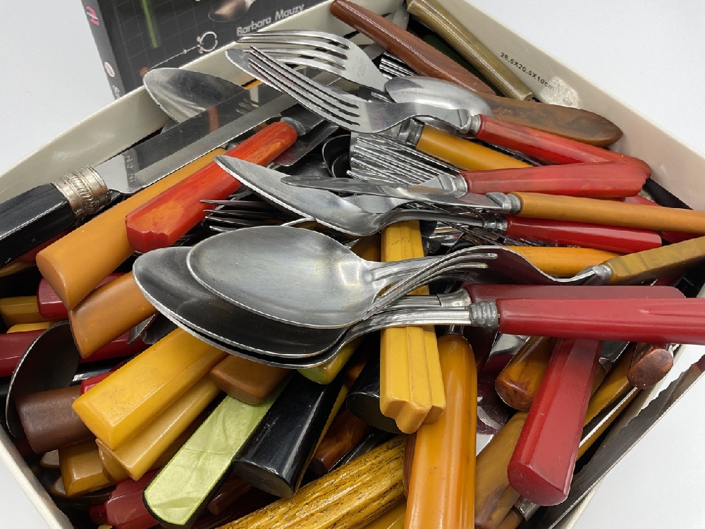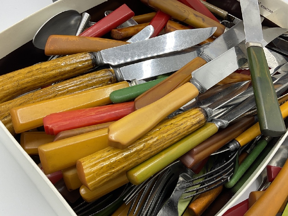 Entire box contents of Bakelite Flatware. Approx. 100+ knives, 20 forks, 31 spoons, pasta fork, cake cutter etc. Also including collector's guide to Bakelite flatware.