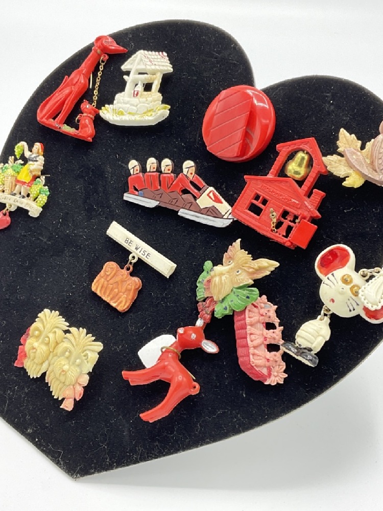 Thirteen (13) Assorted. Bakelite Figural pins. As seen in photograph preview.