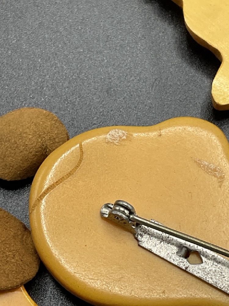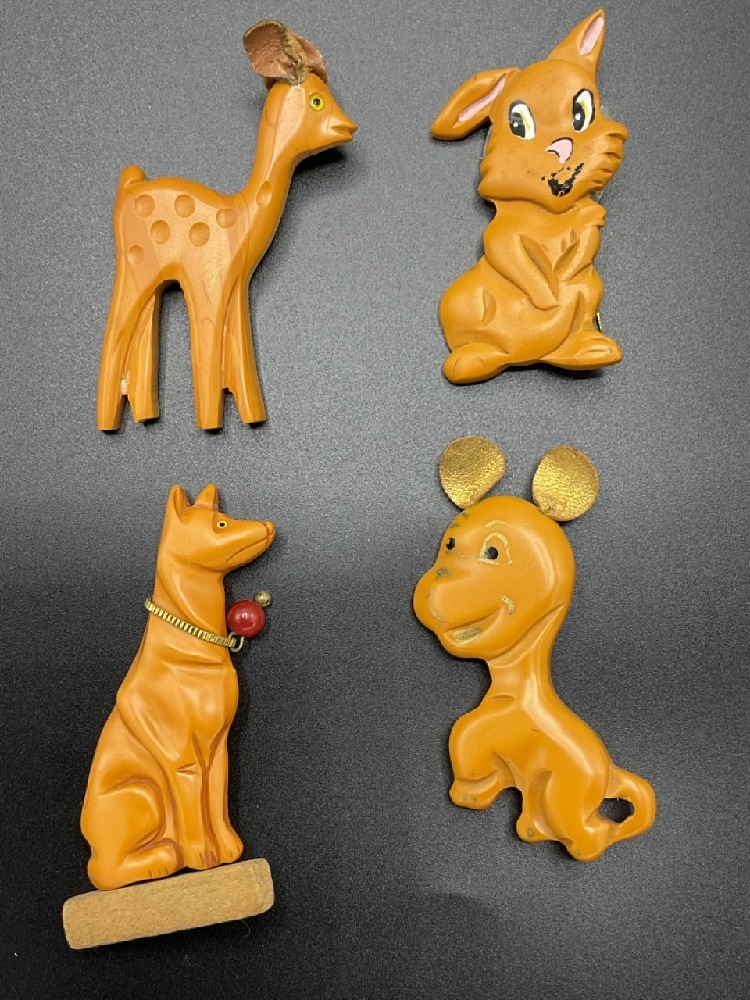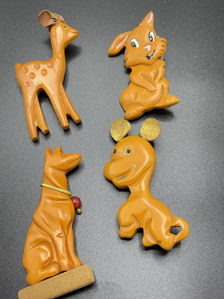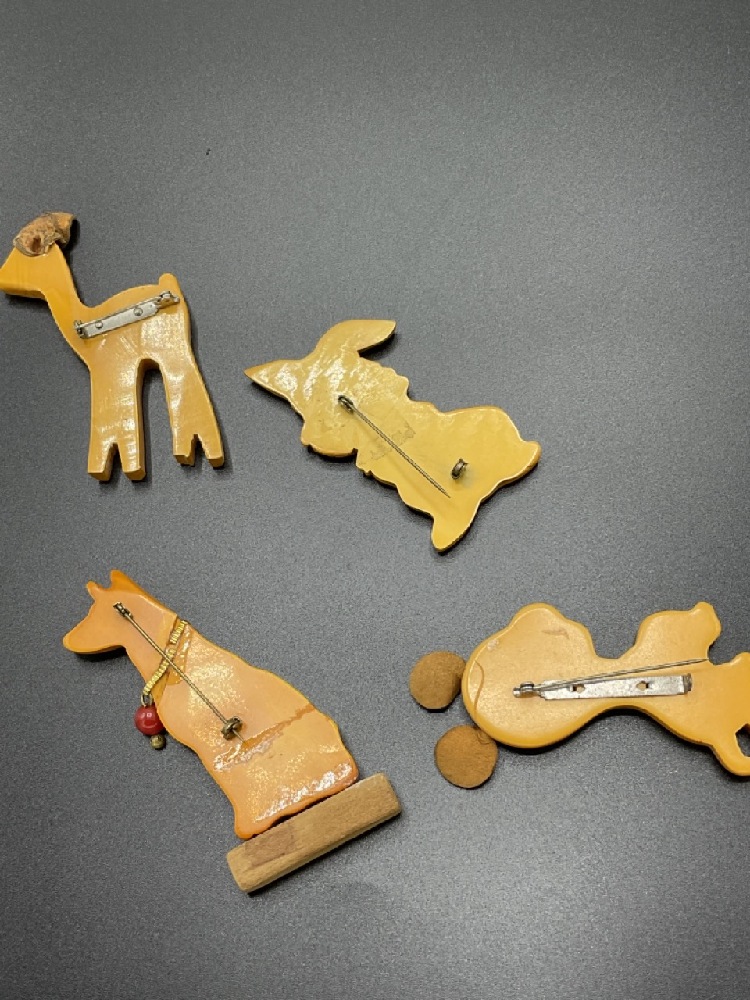 Four (4) Butterscotch Bakelite animal pins. Deer with leather ears, bunny rabbit, dog with leather ears and carved dog with collar. Dimensions: 3“ x 2“, 3 1/2“ x 1 1/2“ and 3 1/2“ x 1 1/2“