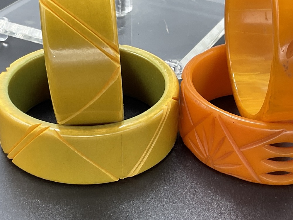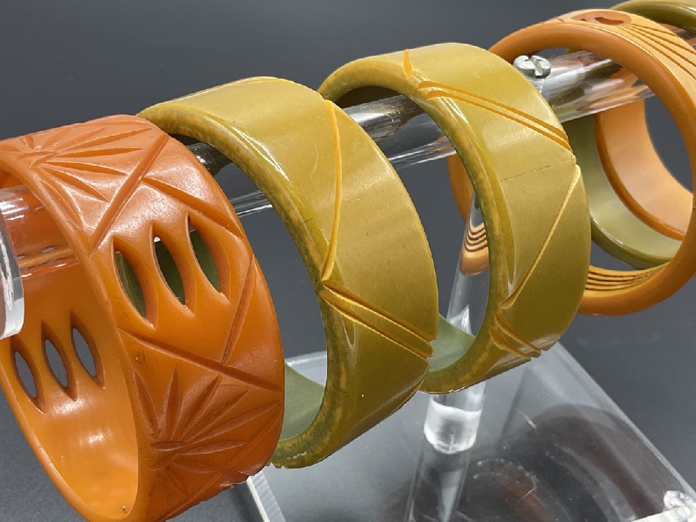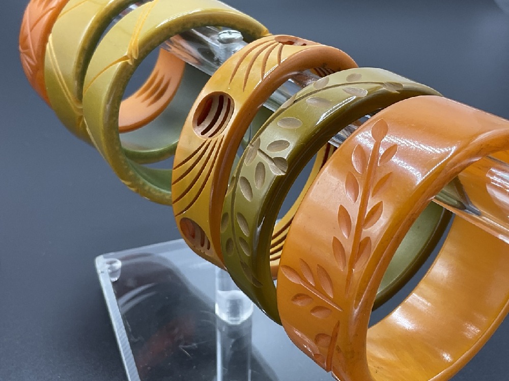 Six (6) Bakelite Bangle Bracelets Olive, Pumpkin and Butterscotch Amber.