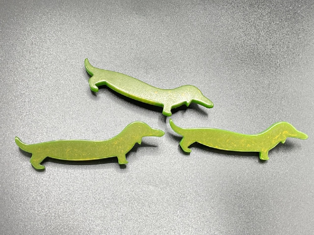 Three (3) Green marbled swirl Bakelite Dachshund dog pins.