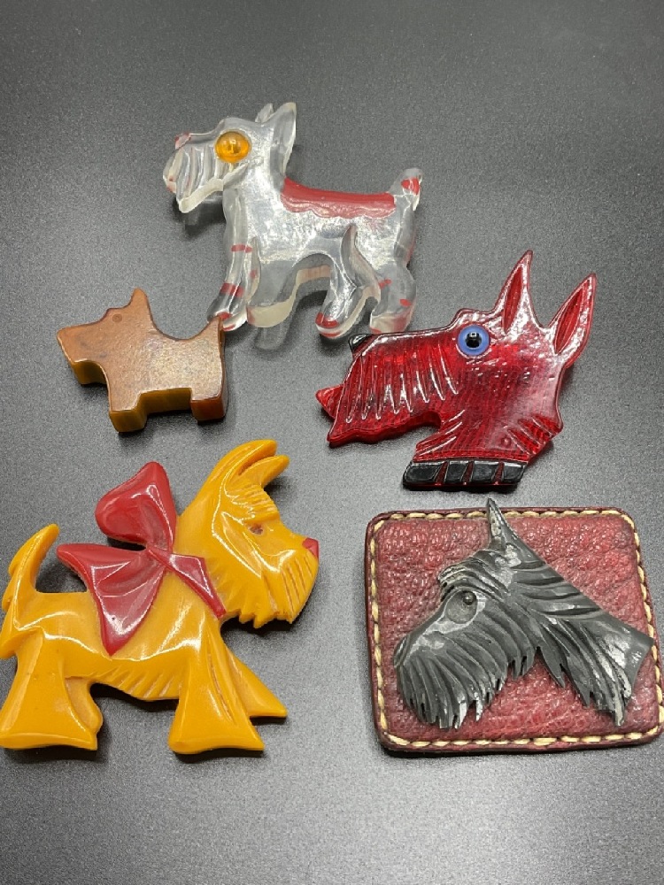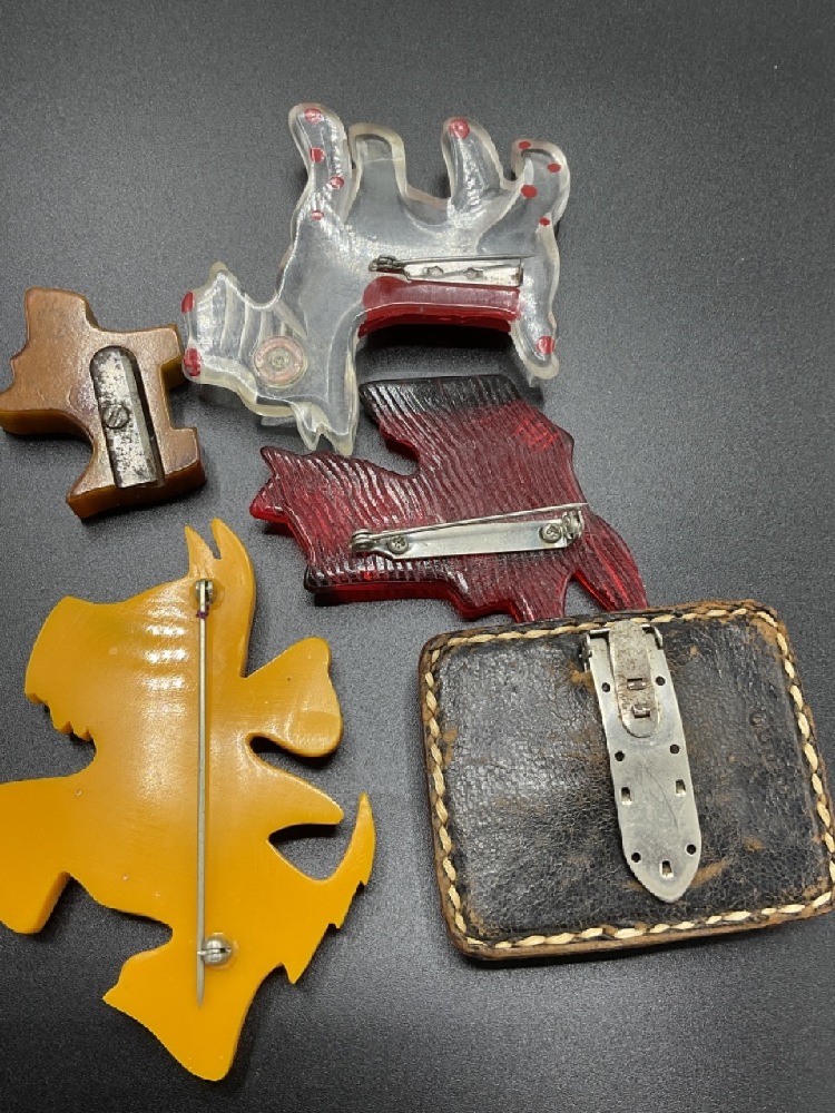 Five (5) Scotty dog pins, clip and pencil sharpener. Carved lucite, leather clips with carved bakelite. Butterscotch pencil sharpener.
