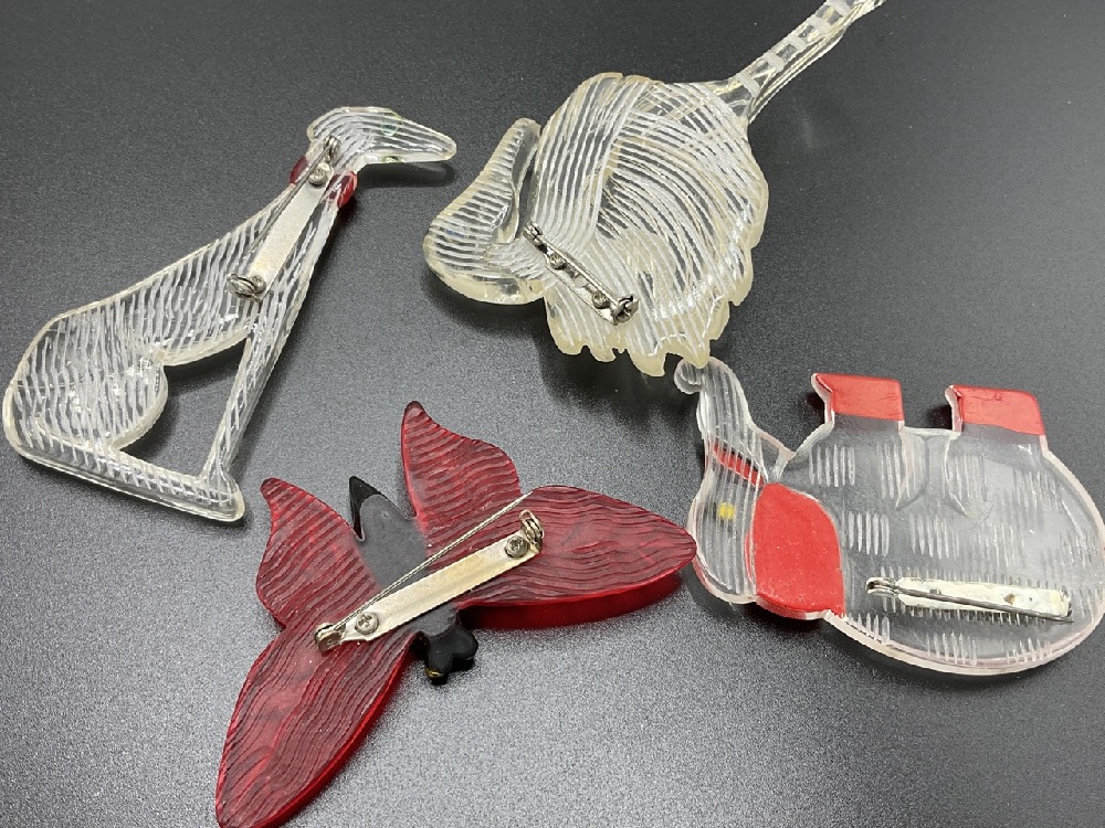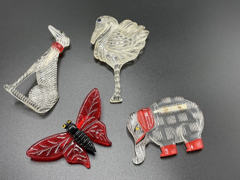 Four (4) Reverse Carved Lucite Figural Pins. Dog, Flamingo, Elephant and Dragonfly.