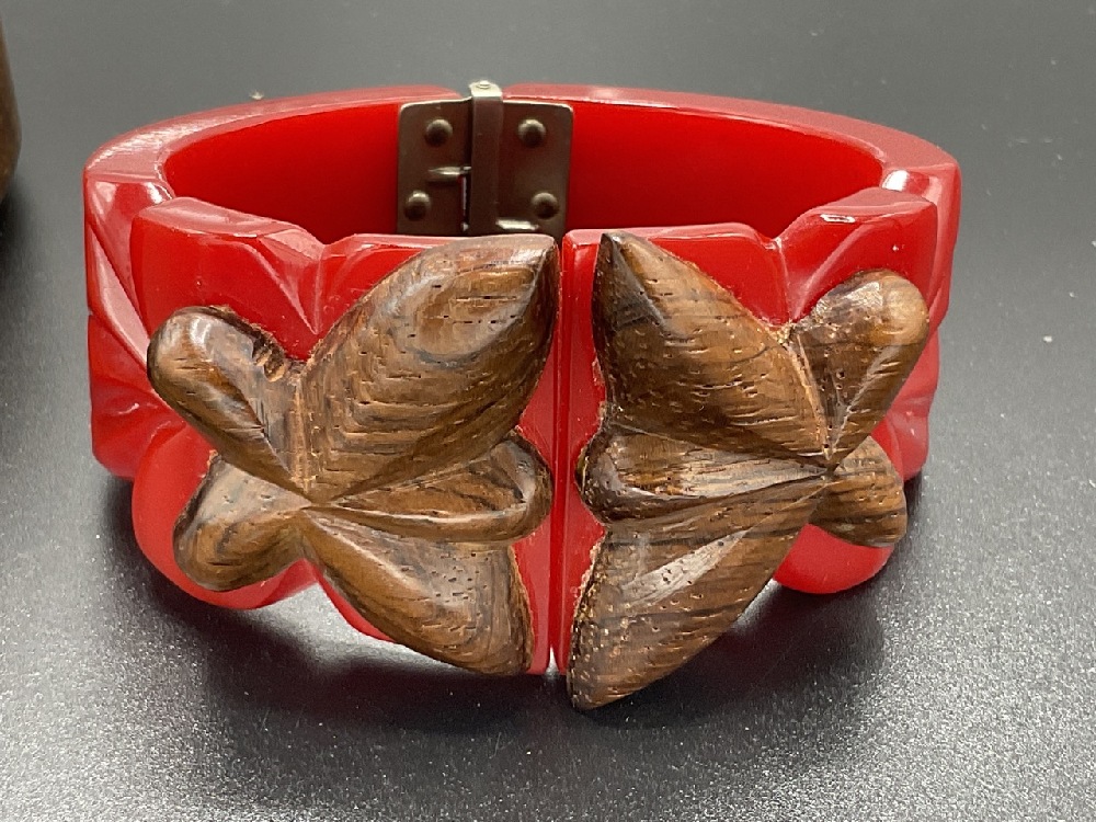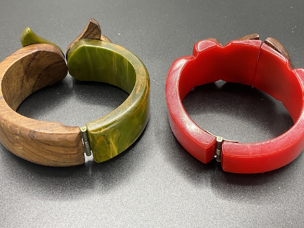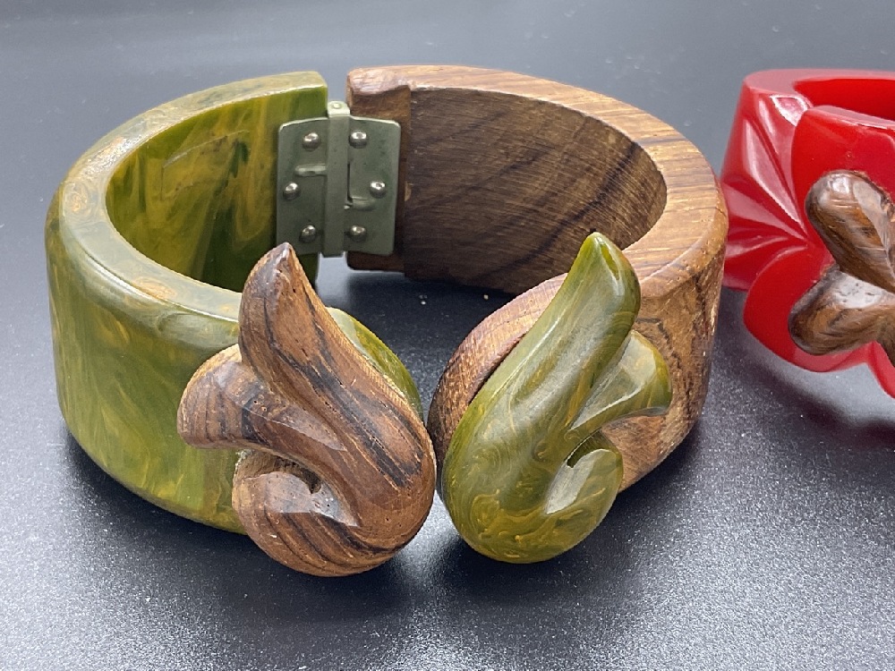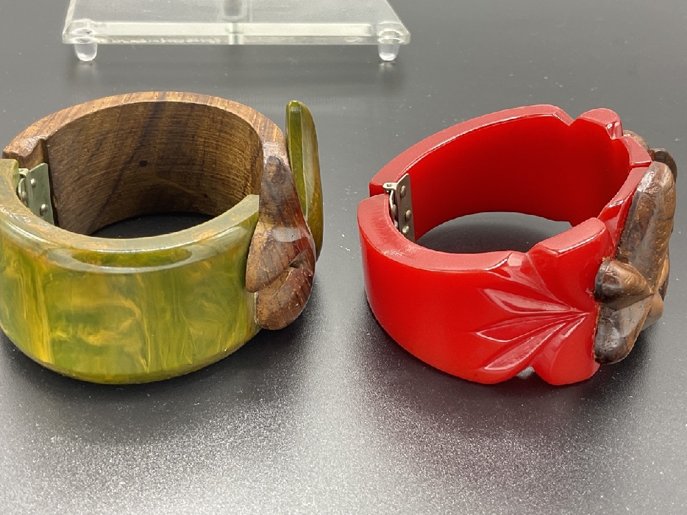 Two (2) Vintage Bakelite Clamper Style Bracelets With Applied Carved Wood Decoration. Red and Olive Green.