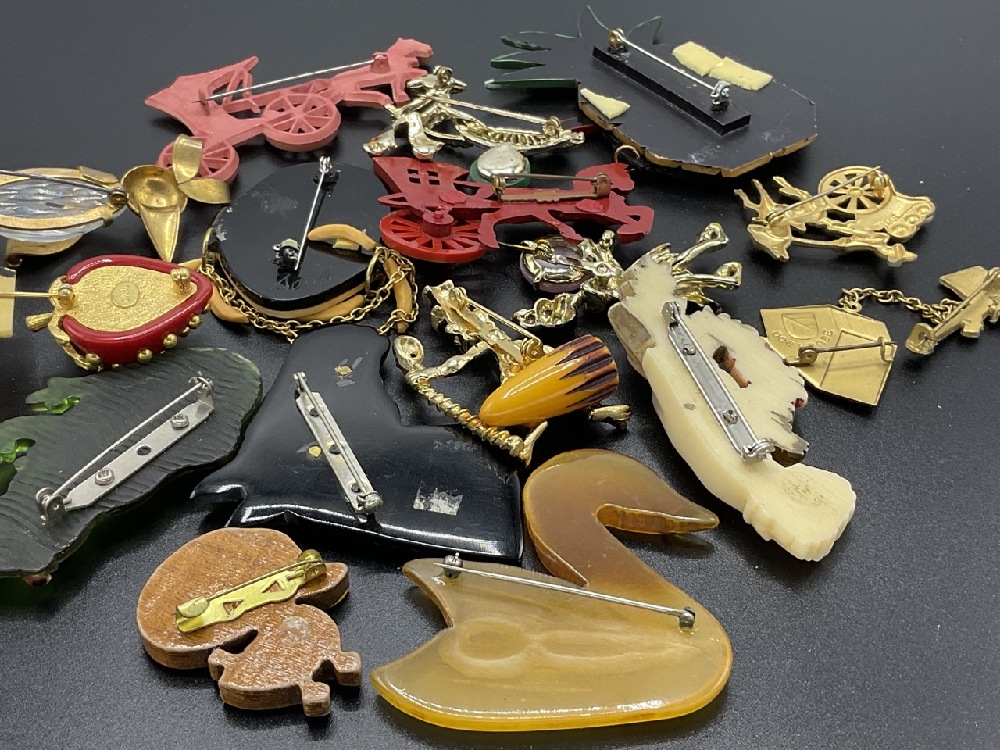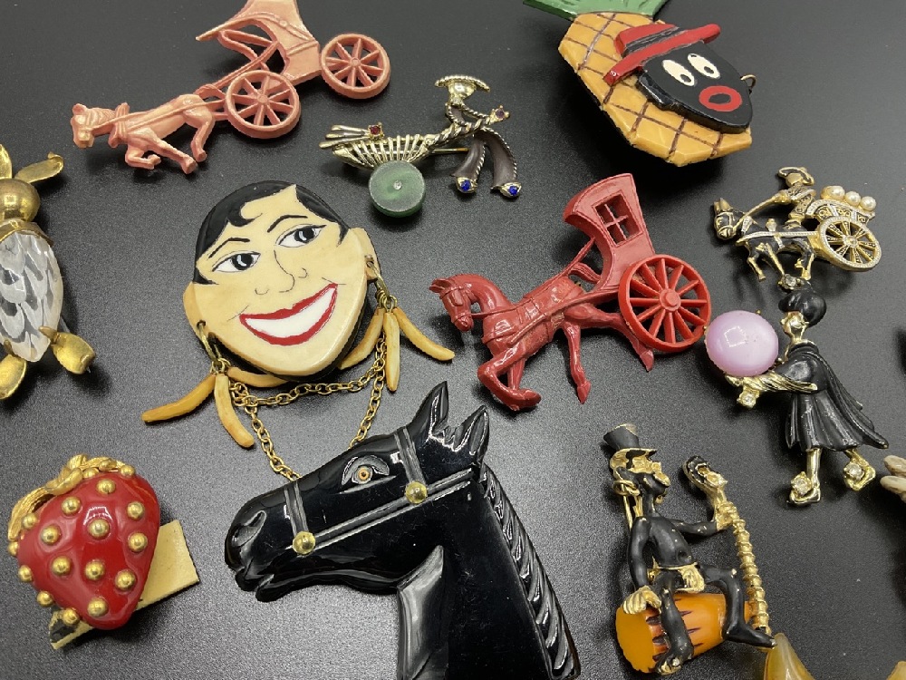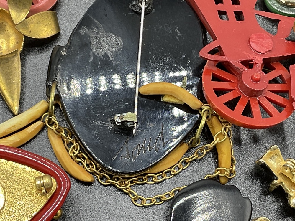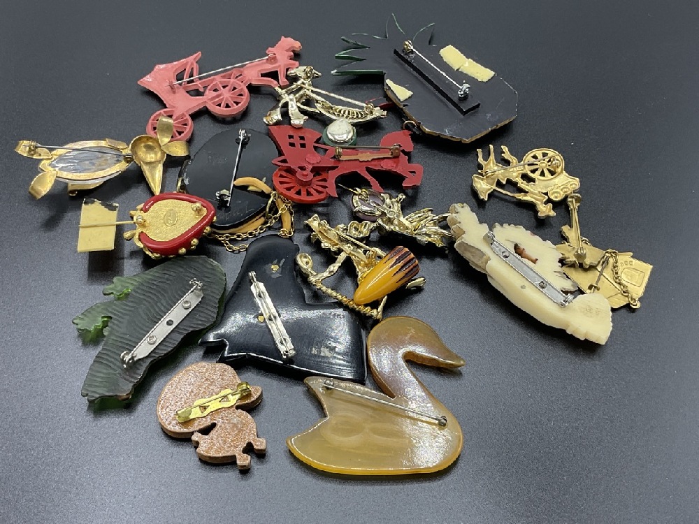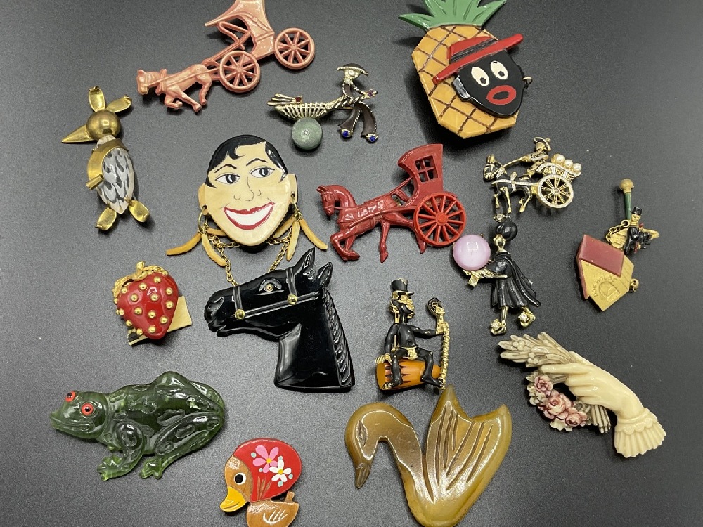 Fifteen (15) Assorted Costume Jewelry Pins. Mostly Bakelite, Vintage Plastic, Metal etc. As seen in photograph preview.