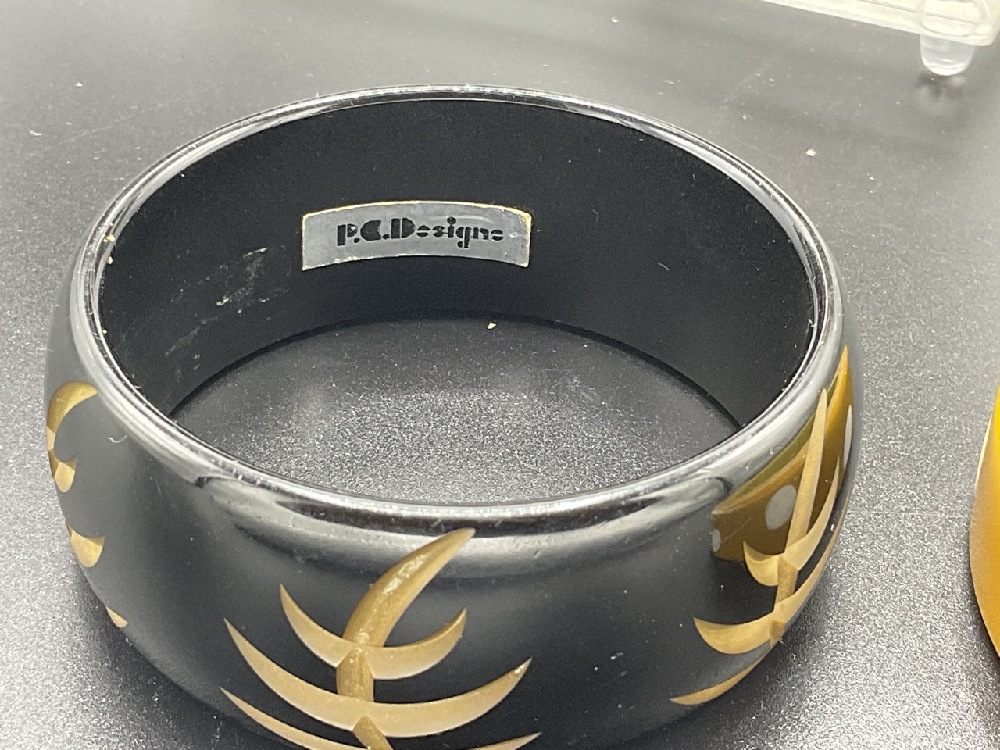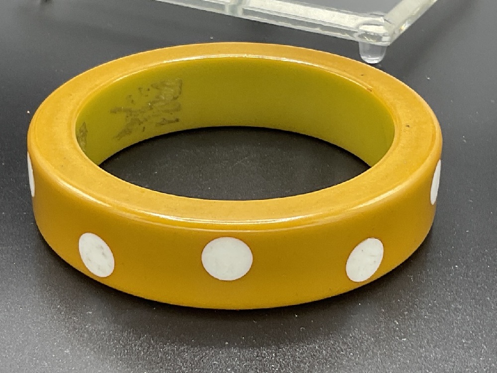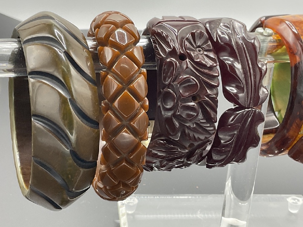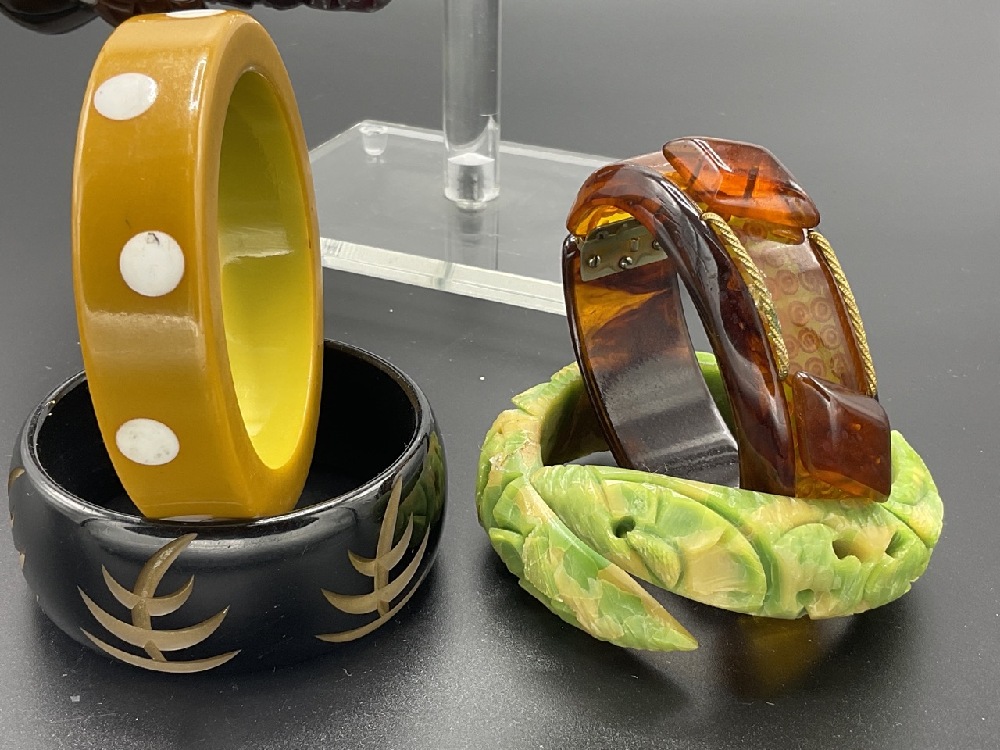 Eight (8) Bakelite Bangle Bracelets including: vintage polka dot, two brown clampers, caramel carved bangle, butterscotch etc.