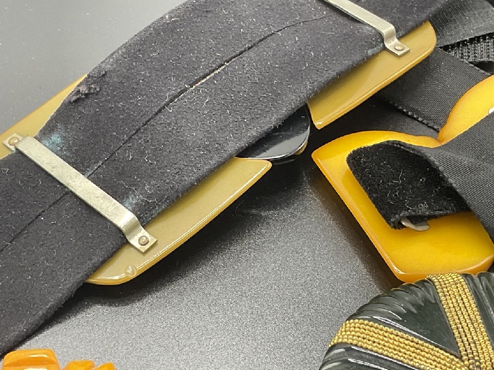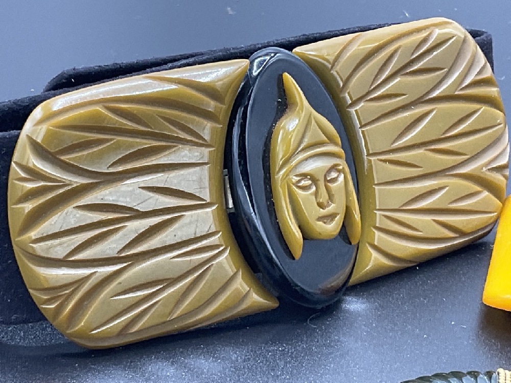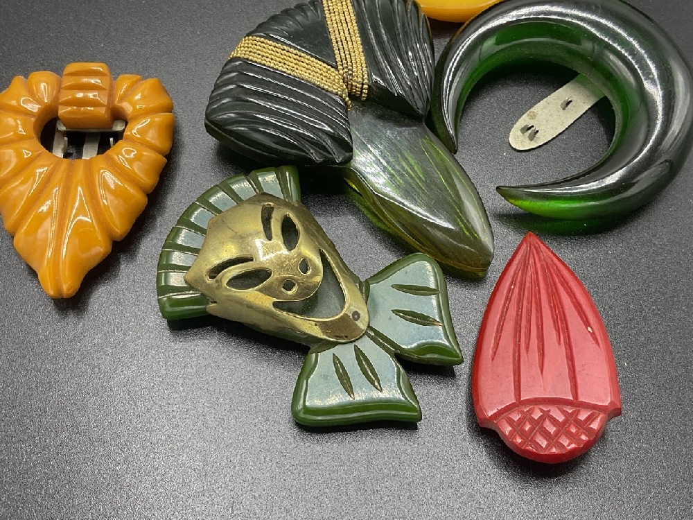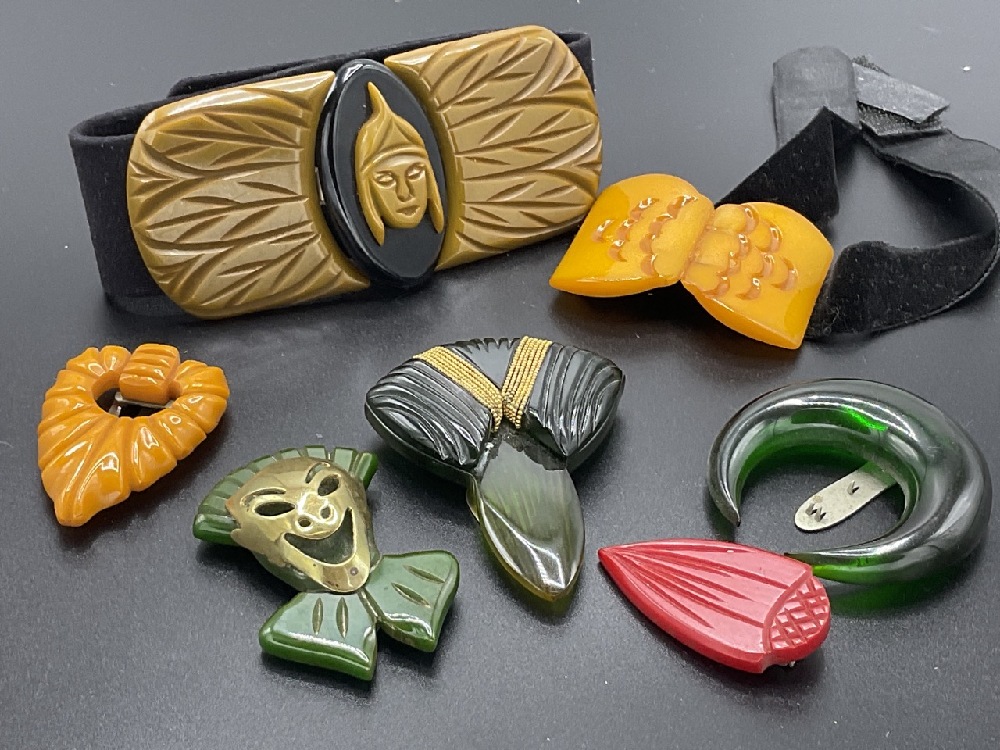 Five (5) Bakelite Clips and Two Buckles. Large olive green and black carved buckle 2" X 4". Singles clips approx. 1 1/2" As seen in photograph preview.