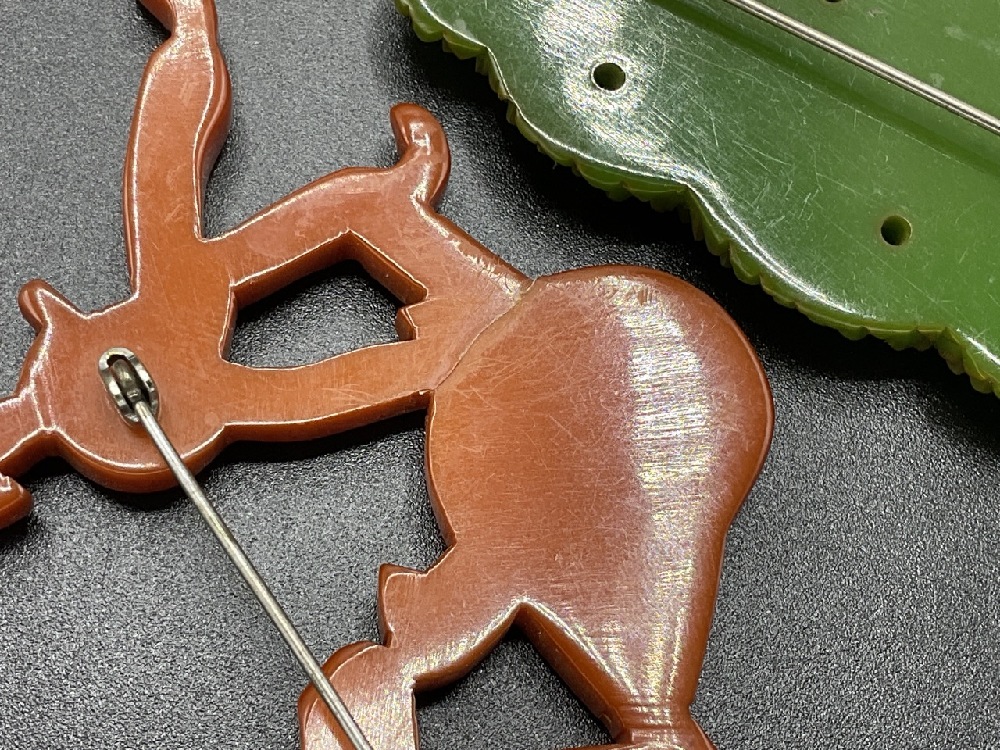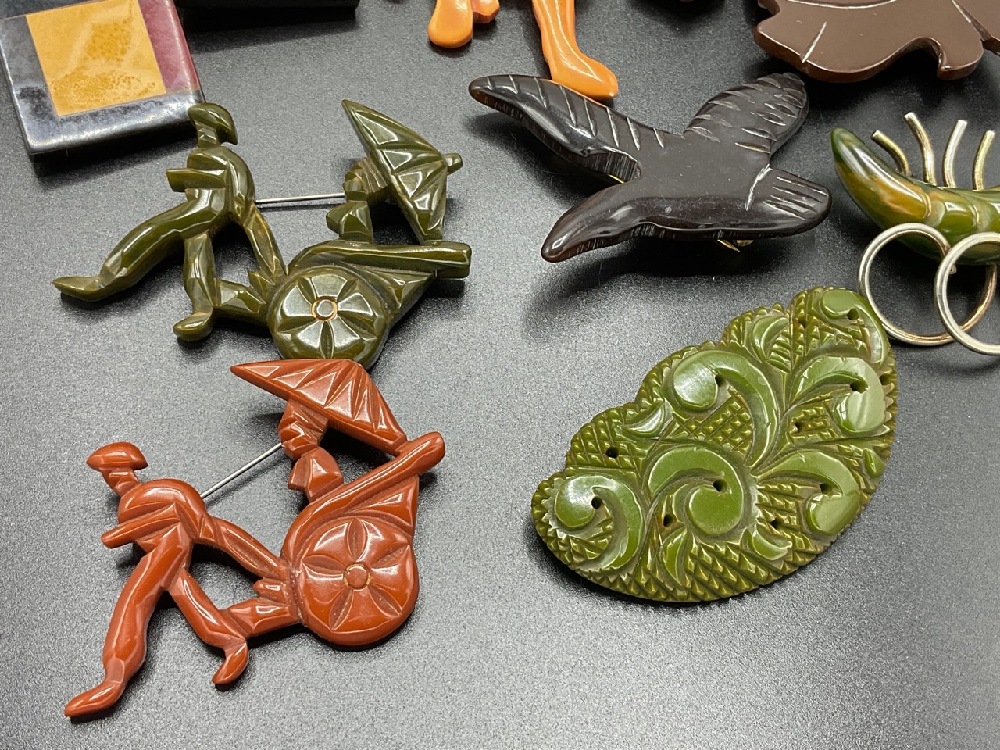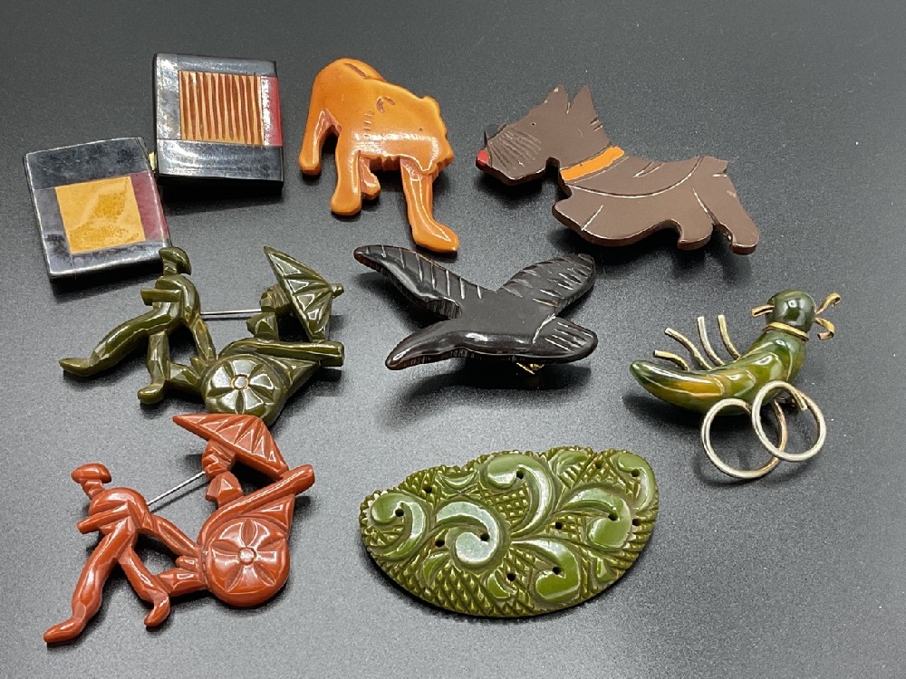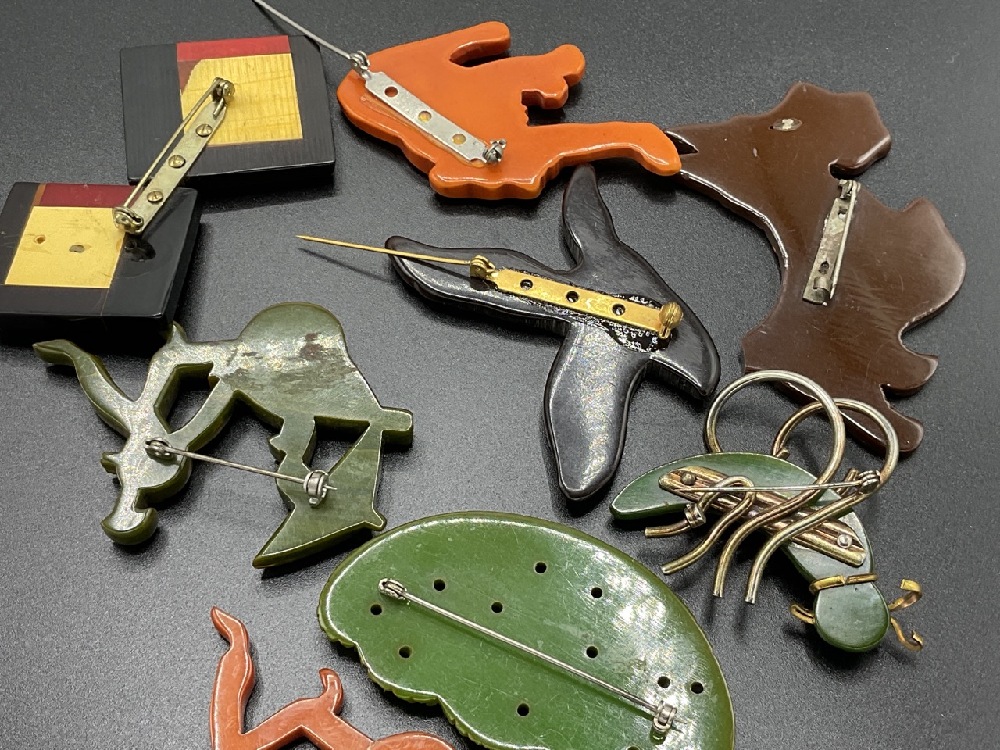 Eight (8) Assorted Bakelite Carved Pins. Scotty Dogs, Geometrics, Caterpillar, Early yellow walking lion etc. As seen in photograph preview.