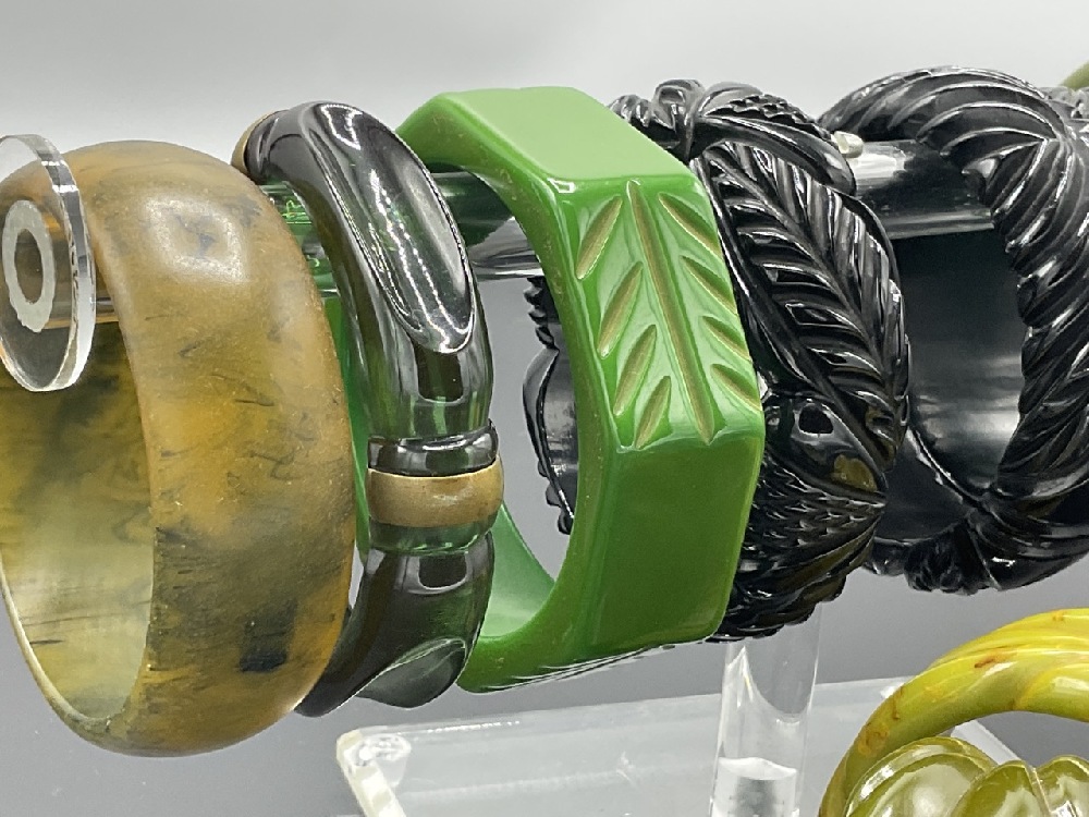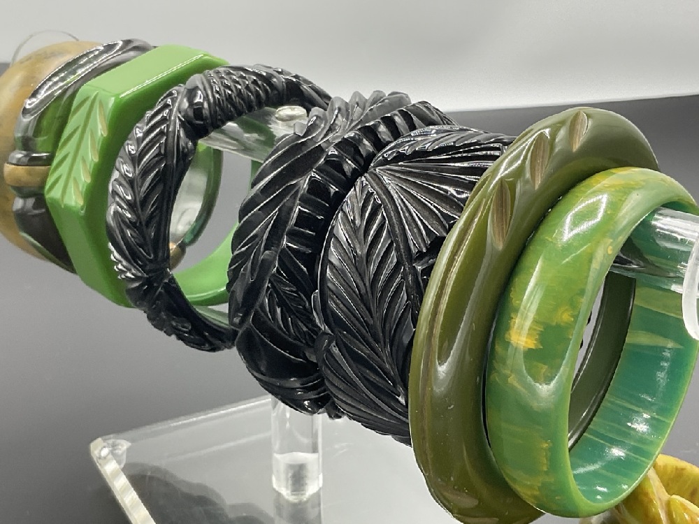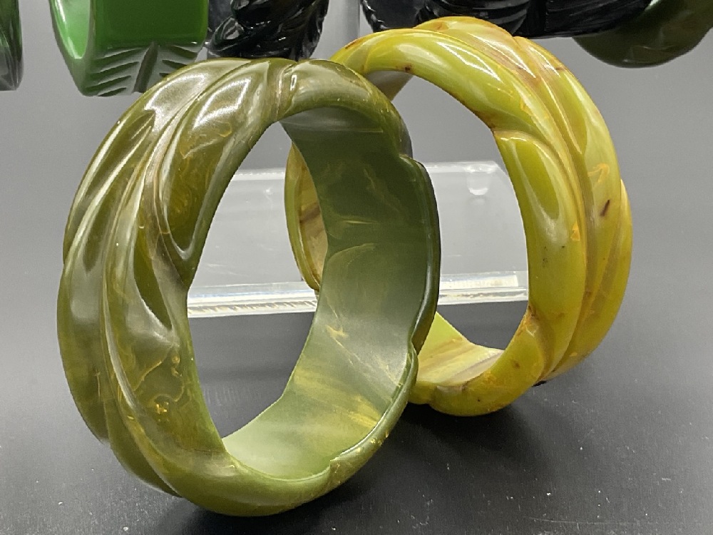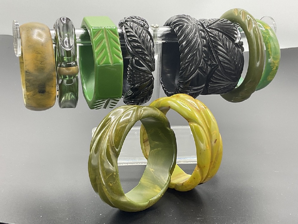 Ten (10) Assorted Green Vintage Bakelite Bangle Bracelets. Apple green, creamed spinach, olive green etc.