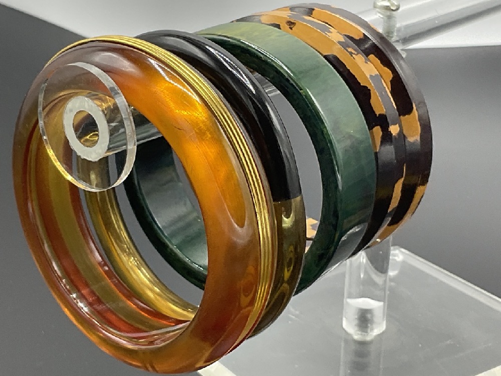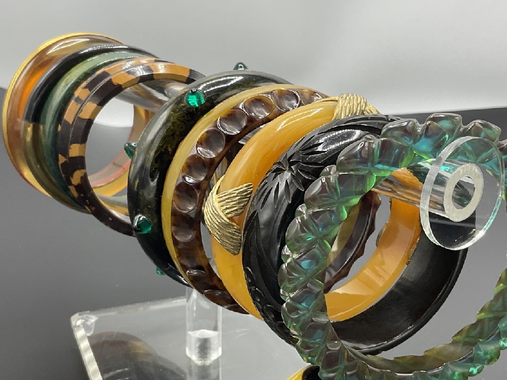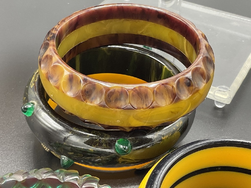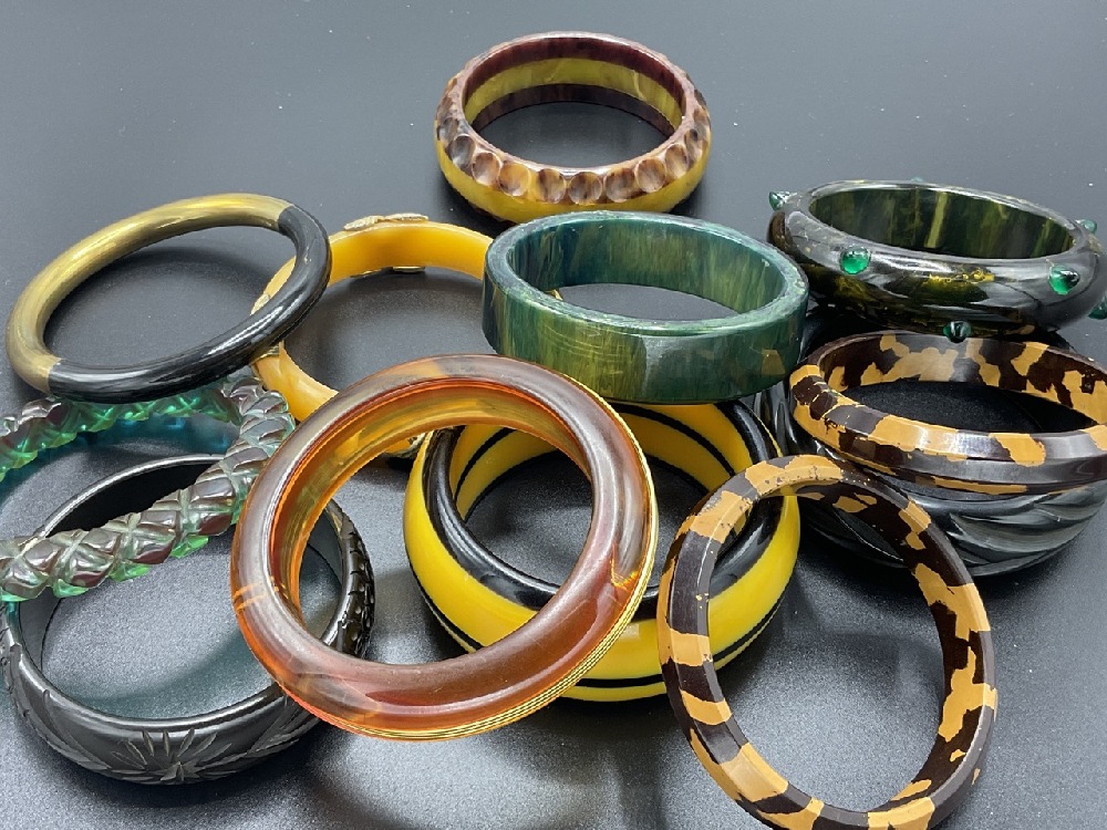 Twelve (12) Assorted Bakelite bangle bracelets. Laminate yellow and black, greens, butterscotch etc. One bracelet is horn (not bakelite) As seen in photograph preview.