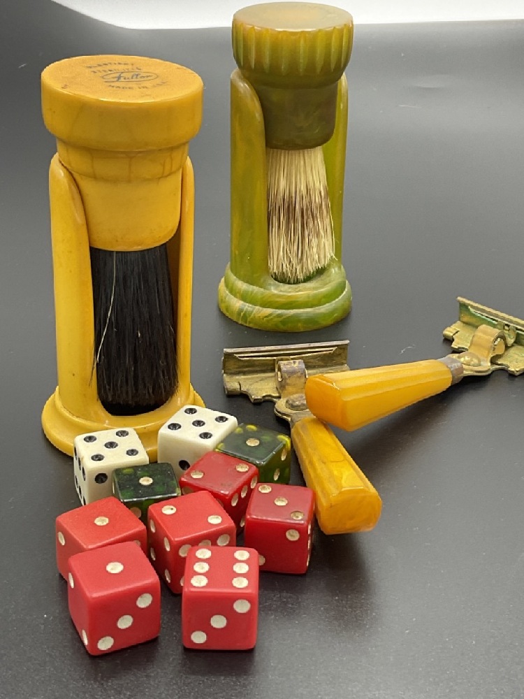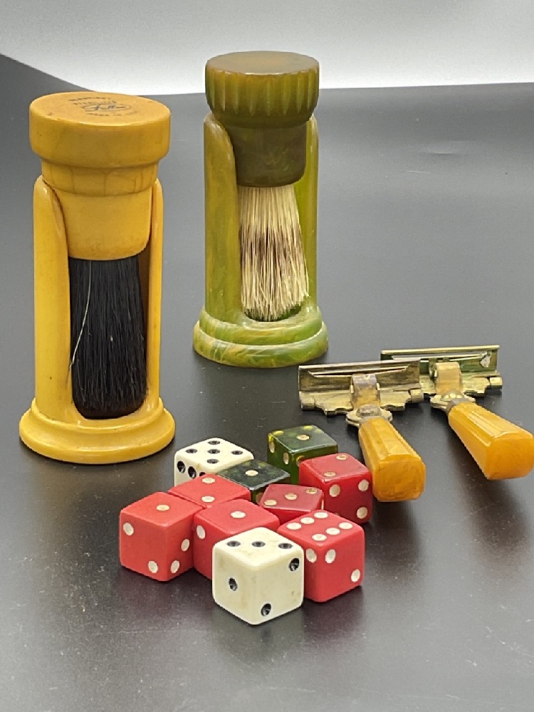 A compiled grouping of Bakelite objects. Bakelite Shaving brushes, razors and dice. As seen in photograph preview.