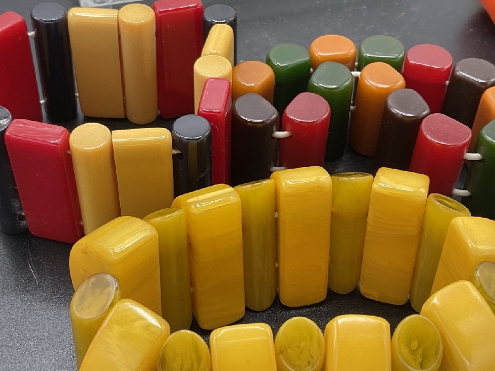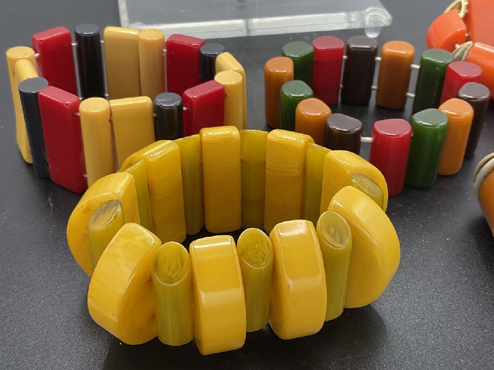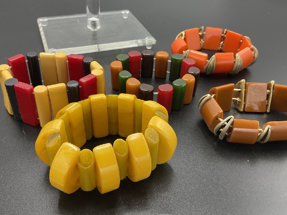 Five (5) Vintage Bakelite Strech bracelets. Assorted colors, two with metal bar spacers.