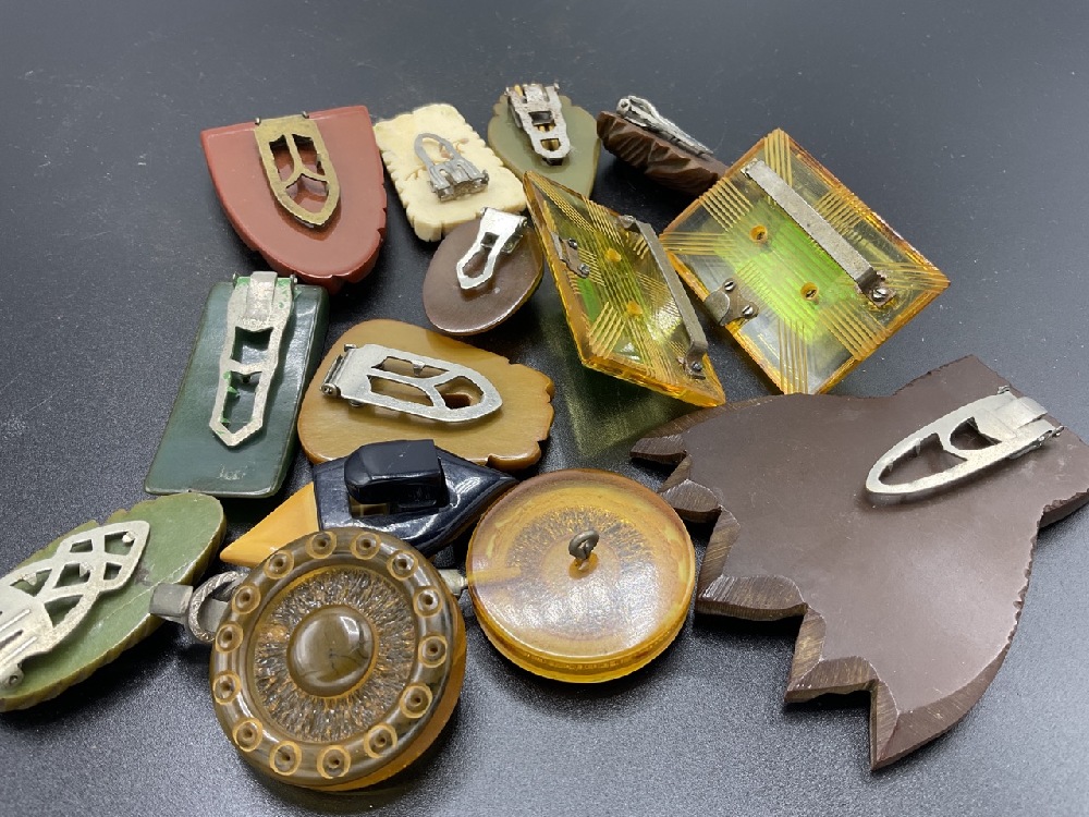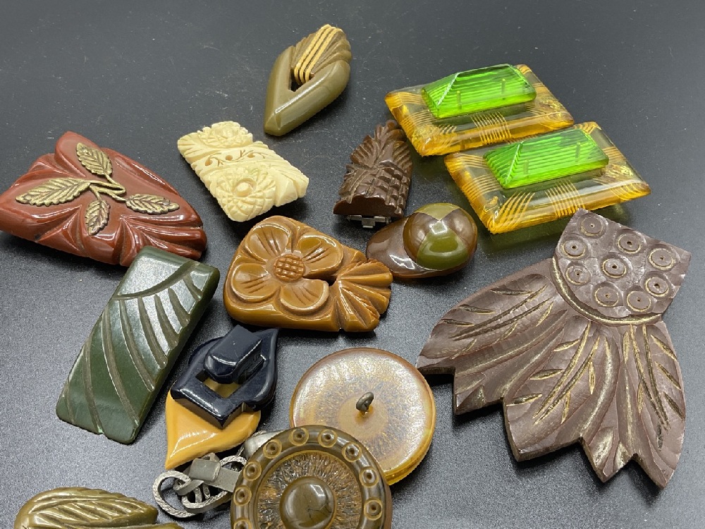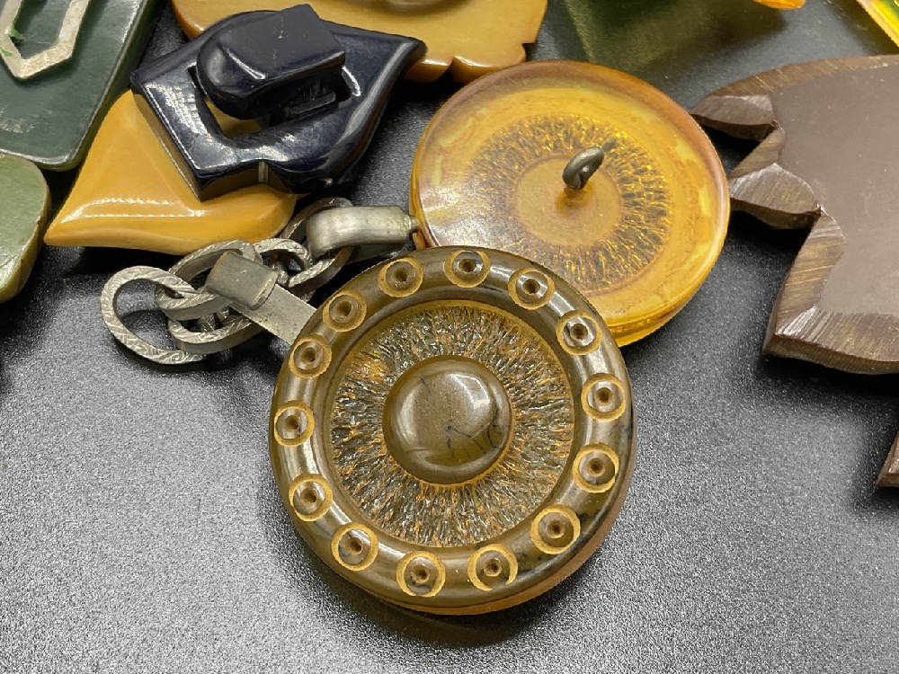 Ten (10) Vintage Bakelite Clips and Buckles including a very fine reverse carved apple juice with fluorescent green buckle. As seen in photograph preview.