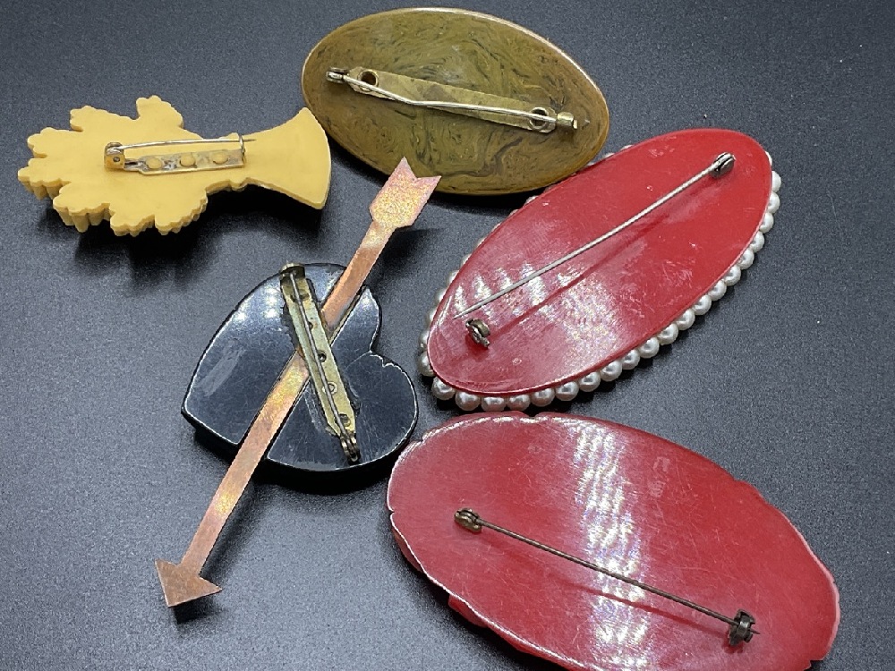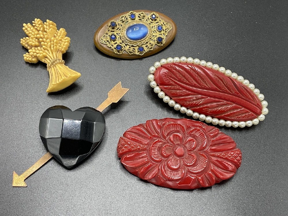 Five (5) carved and decorated Bakelite Brooches/Pins including red and black heart with arrow, sheaf of wheat, carved red brooches and jeweled brooch.