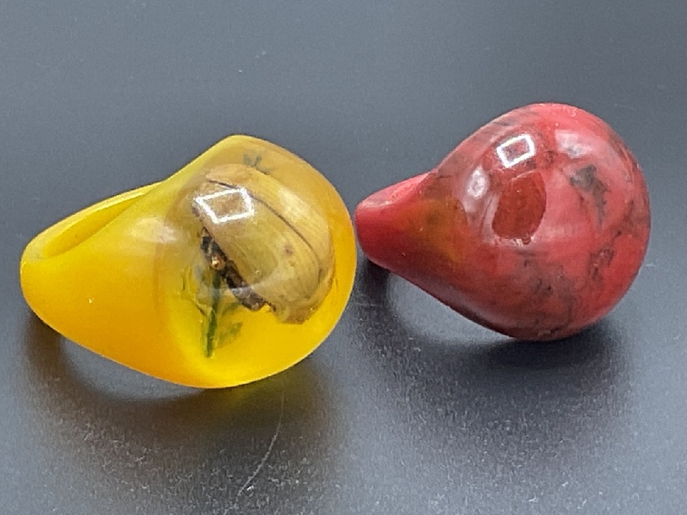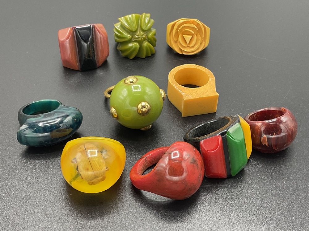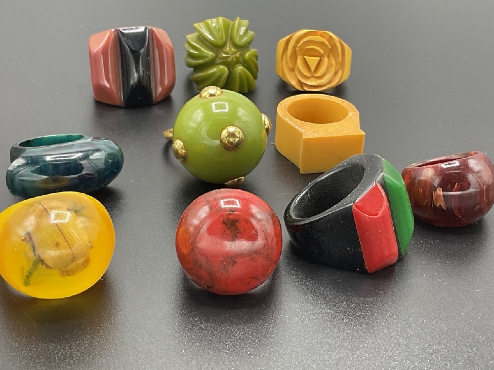 Ten (10) Vintage Bakelite and Lucite rings. Assorted colors, laminate, carved, lucite irridescent bug ring.