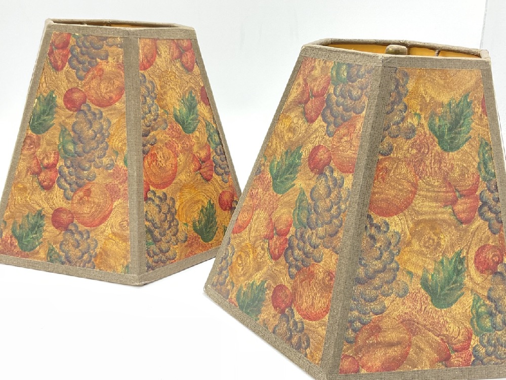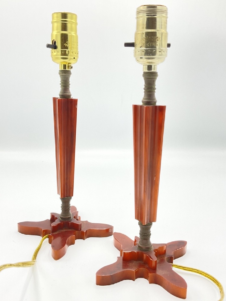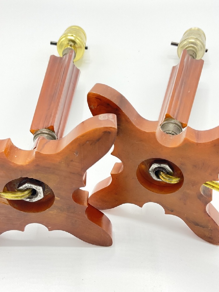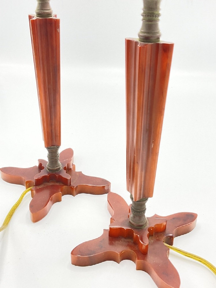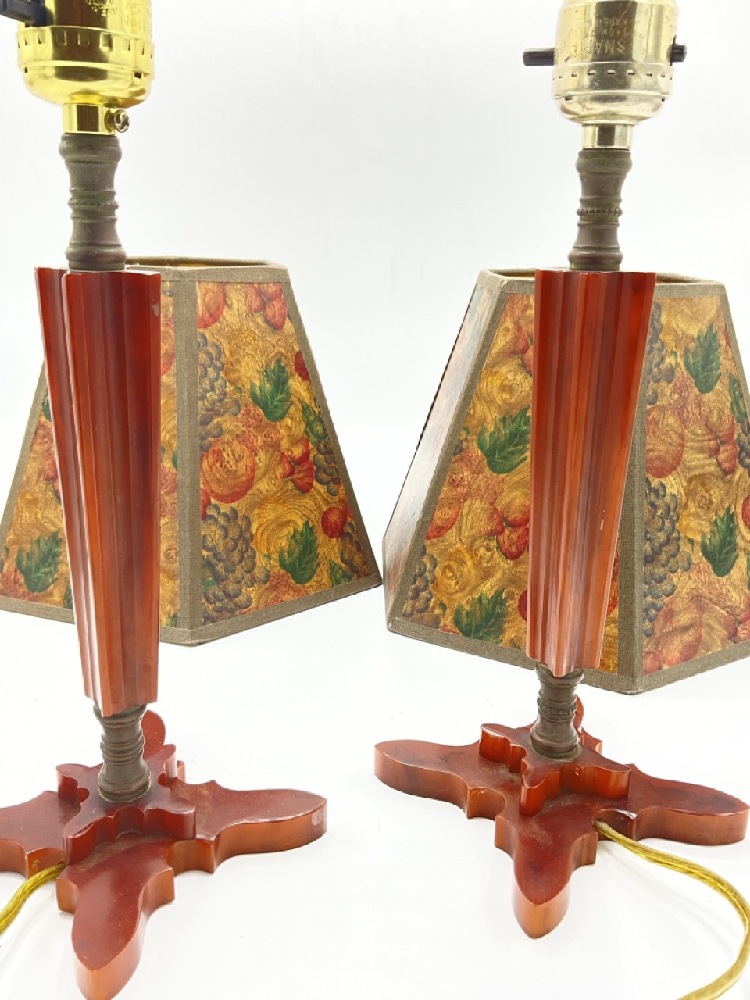 A pair of vintage Bakelite cherry amber boudoir table lamps. A fine quality pair of flora print lamp shades included.