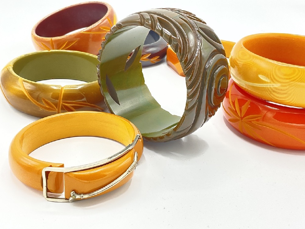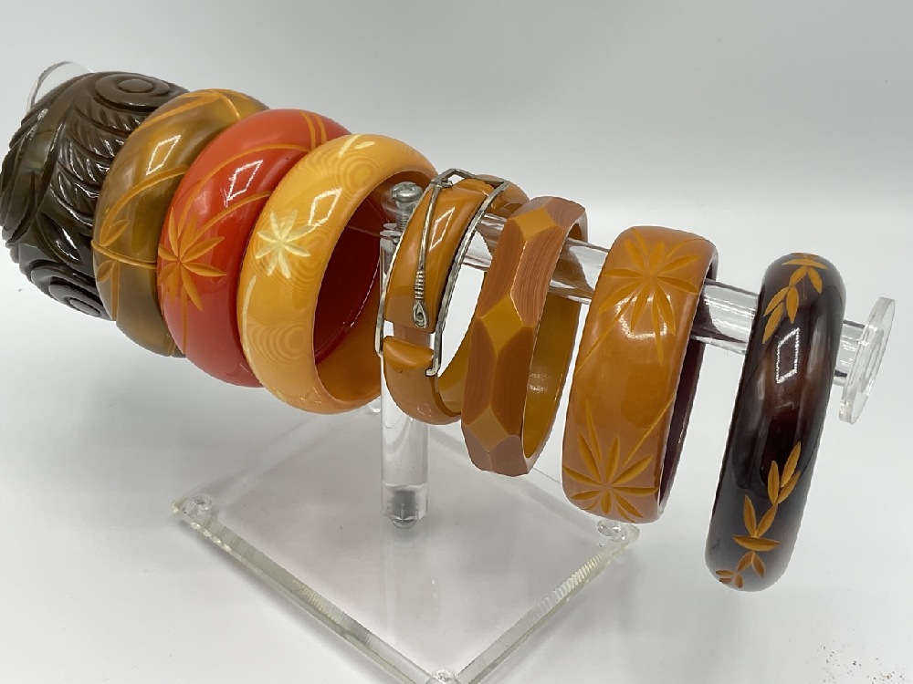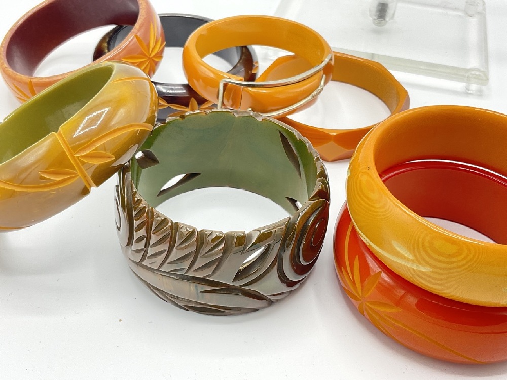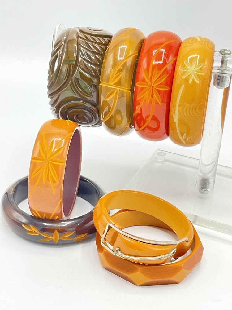 Eight (8) Vintage Bakelite Bangle Bracelets. Olive green, butterscotch, red, brown etc.