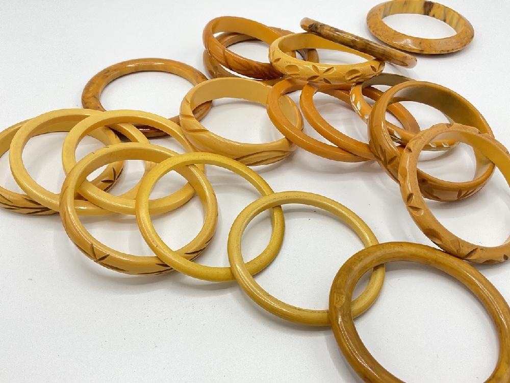Nineteen (19) Vintage Bakelite Bangle Bracelets. Butterscotch, Caramel Swirl, Orange Cream etc.