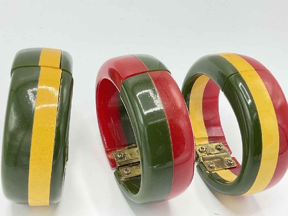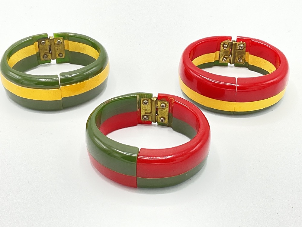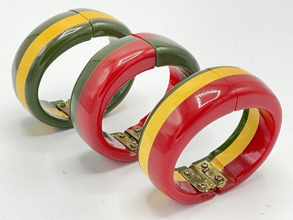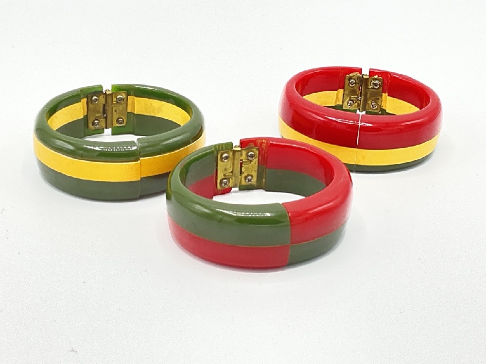 Three (3) Vintage Laminated Red, Green and Cream Colored Bakelite Clamper Bracelets.