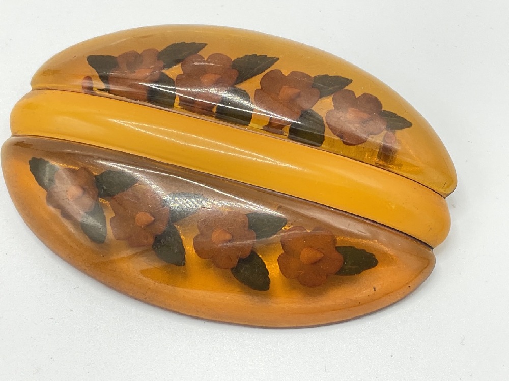 Reversed carved apple juice Bakelite brooch.